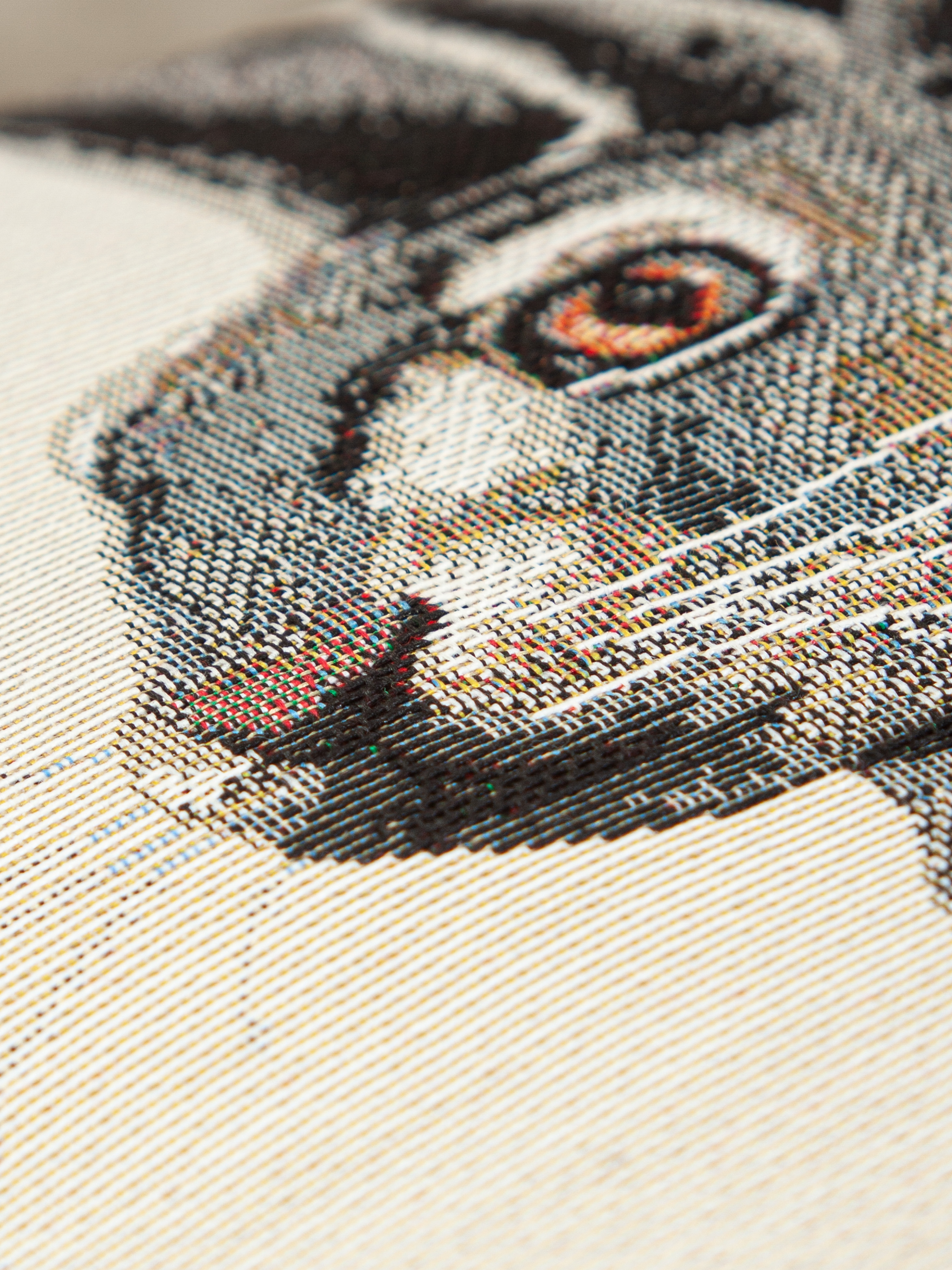 Рисунок создается переплетением нитей различных цветов и фактуры. Состав ткани: хлопок ( дающий фактуру и приятную тактильность ) и синтетические нити ( придающие износостойкость ). Плотность гобелена 410 г на кв.метр.