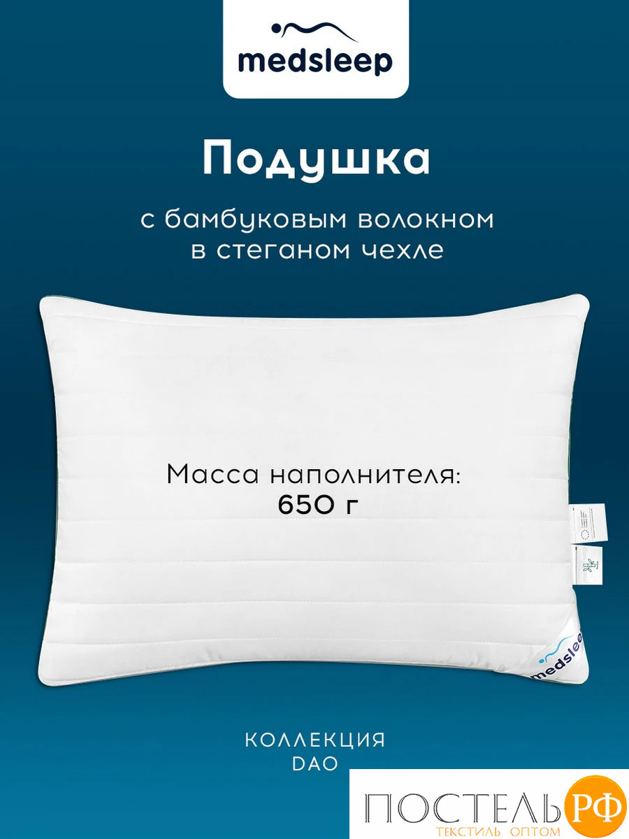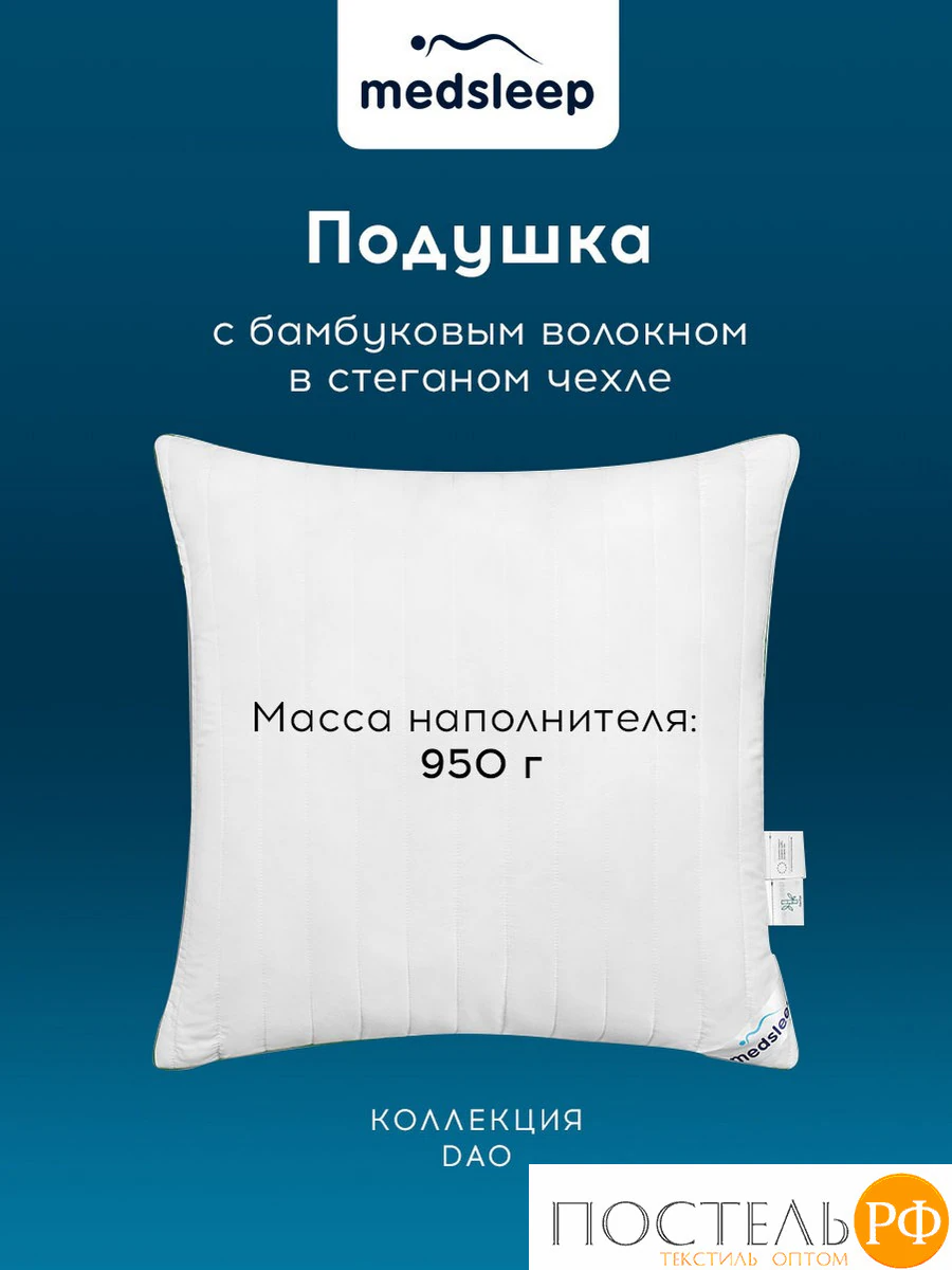 Бамбуковая подушка стеганая коллекции «Dao» в размере 70*70 имеет чехол из смесовой ткани 50% бамбуковое волокно и 50% микрофибра, наполнитель чехла 70% бамбуковое волокно и 30% микроволокно Лебяжий пух. Наполнитель ядра подушки 100% микроволокно Лебяжий пух Ultra Soft. Масса наполнителя: 950гр.