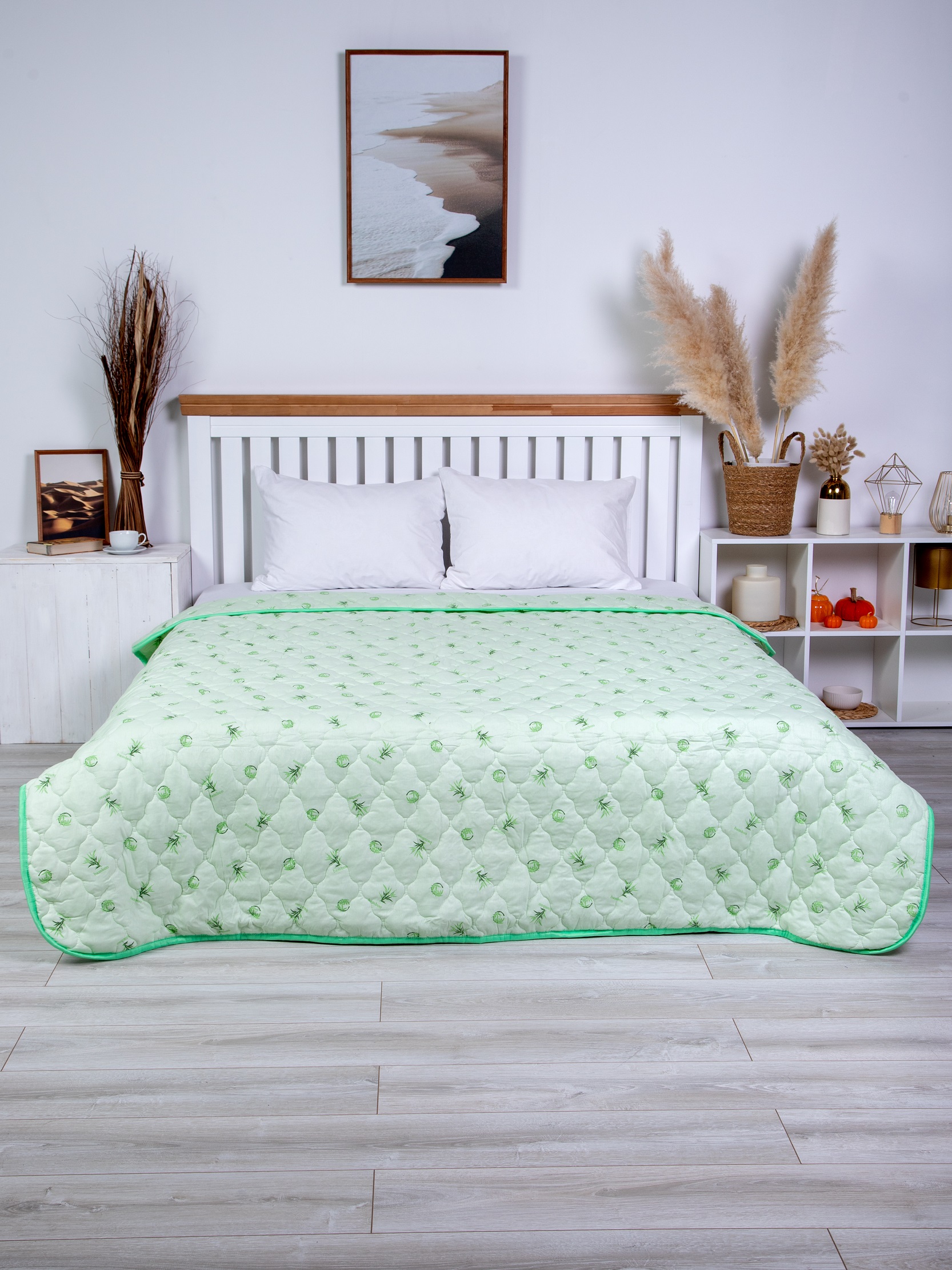 Одеяло Евро-макси с наполнением из термофиксированного бамбукового волокна плотностью 300 гр/кв.м., окантовано широкой тесьмой. Ткань из натурального хлопка отлично пропускает воздух, что способствует регуляции теплообмена во время сна. Упаковка - сумка ПВХ с ручками.