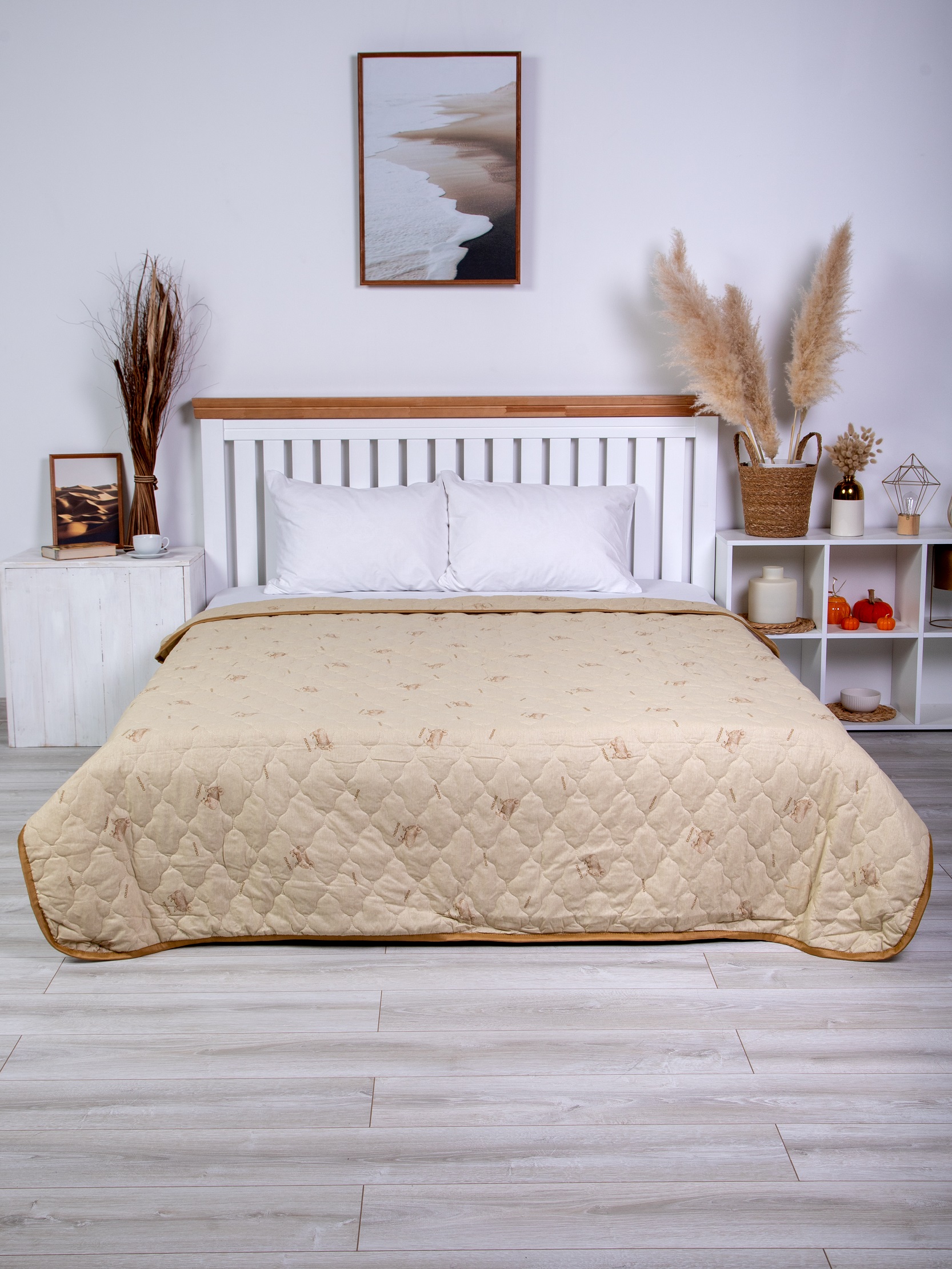 Одеяло-покрывало 1,5-спальное с наполнением из термофиксированной овечьей шерсти плотностью 150 гр/кв.м., многоигольная стежка, окантовано широкой тесьмой. Материал чехла из 100% хлопка. Упаковка - сумка ПВХ с ручками.