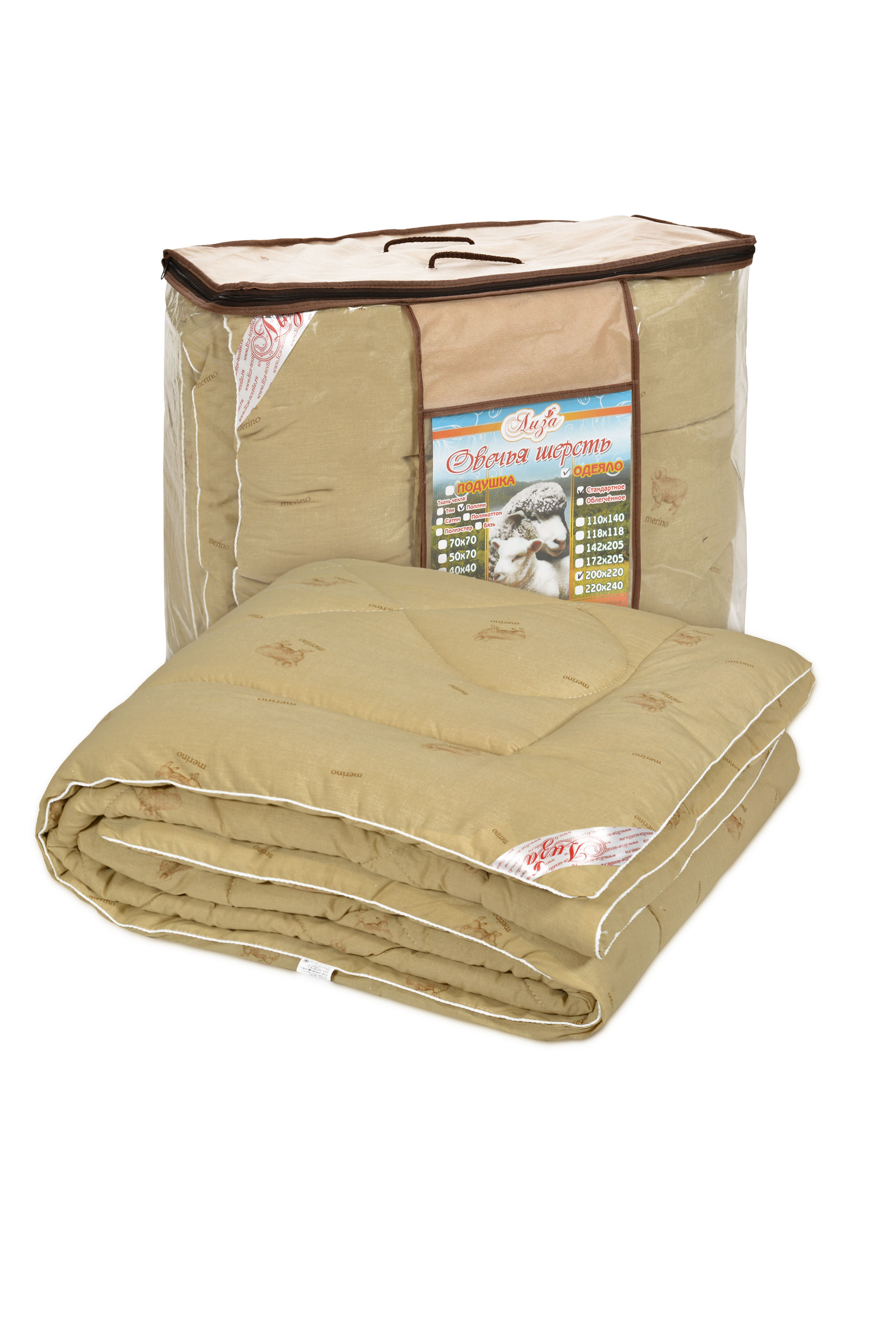 Одеяло стеганое 1,5-спальное с наполнением из термофиксированной овечьей шерсти, утолщенное - плотность не менее 400 гр/кв.м. Одноигольная стежка, отделочный элемент - вшивной кант. Упаковка - сумка ПВХ с ручками. Материал чехла из 100% хлопка.