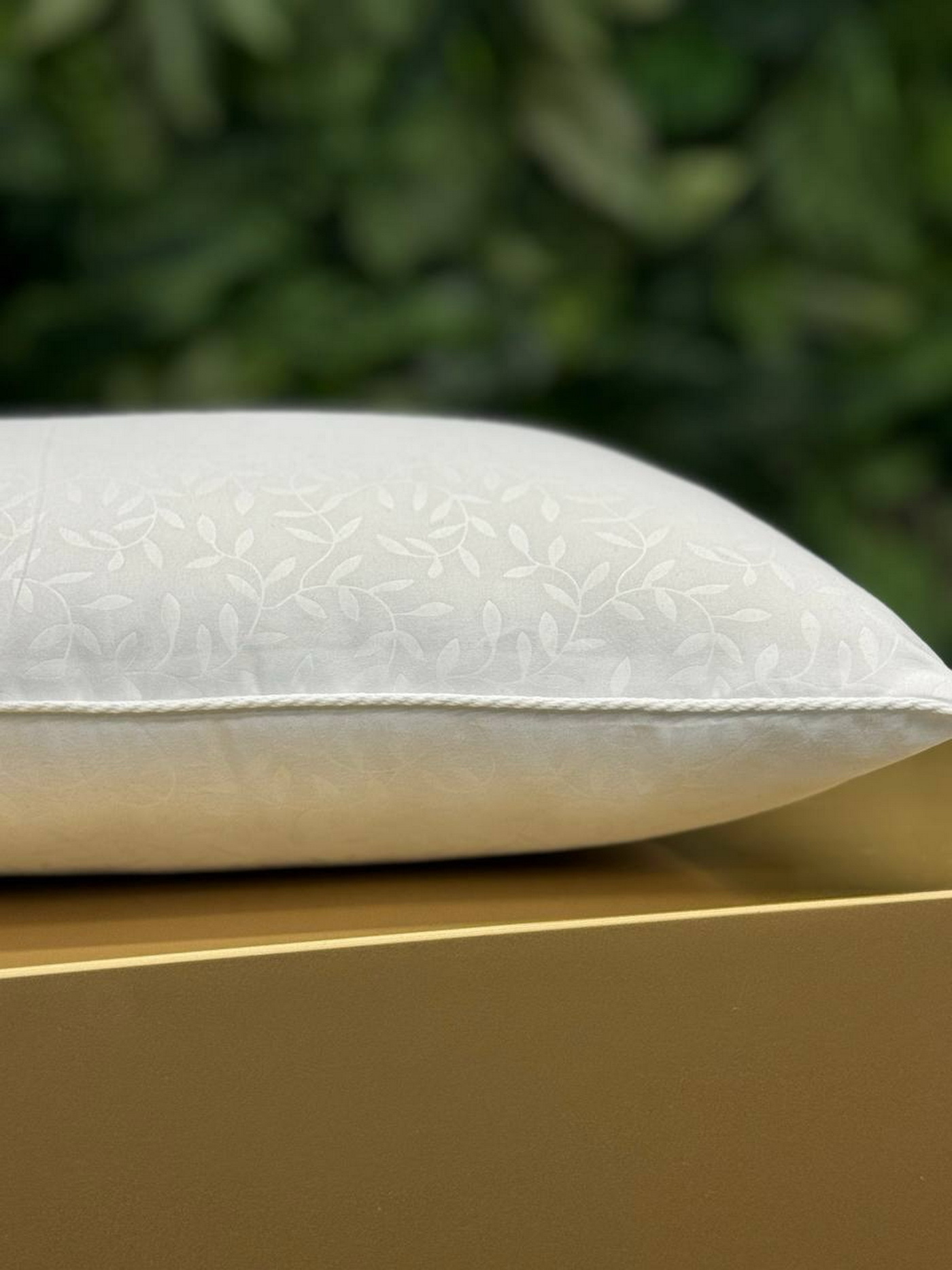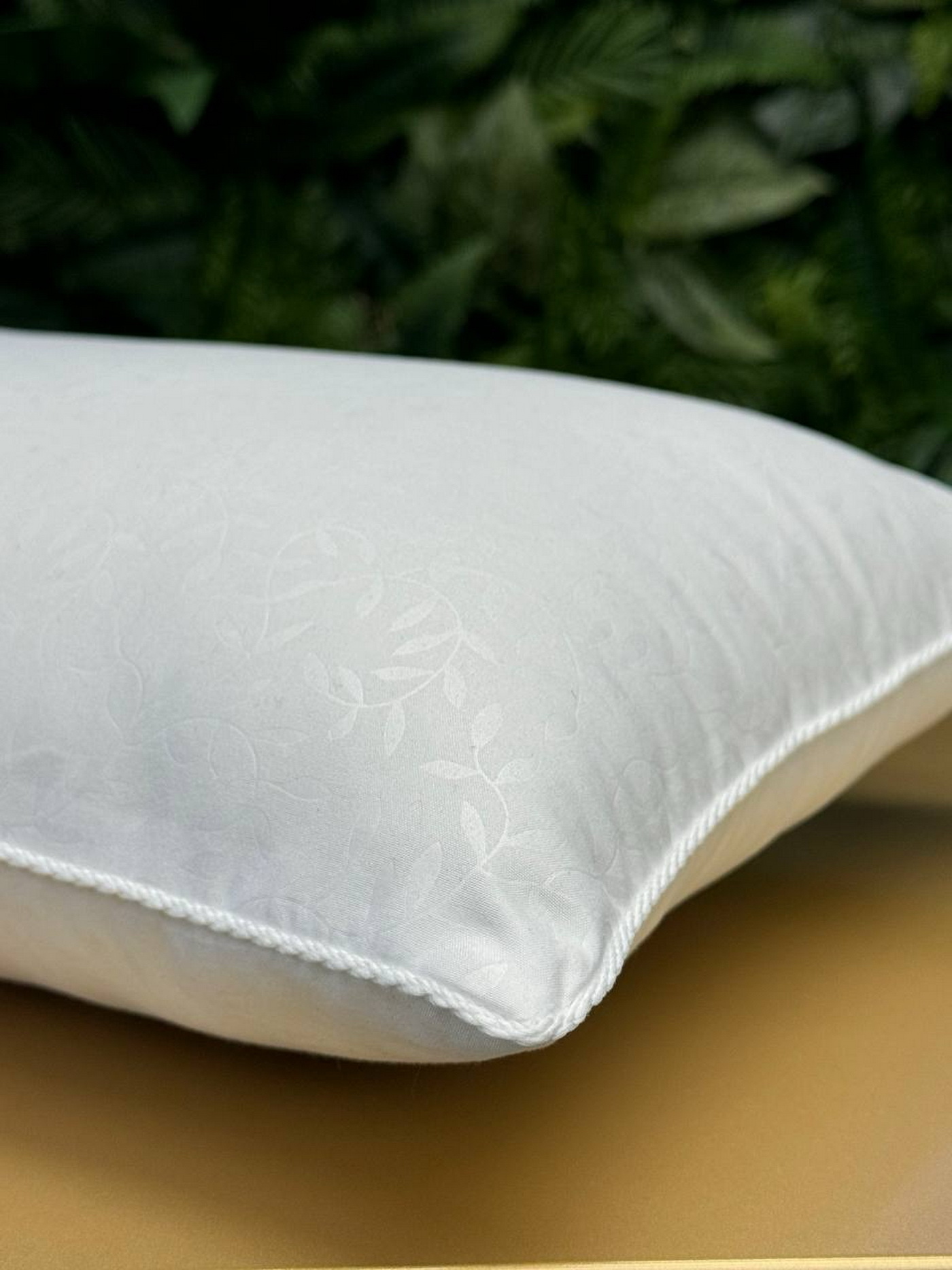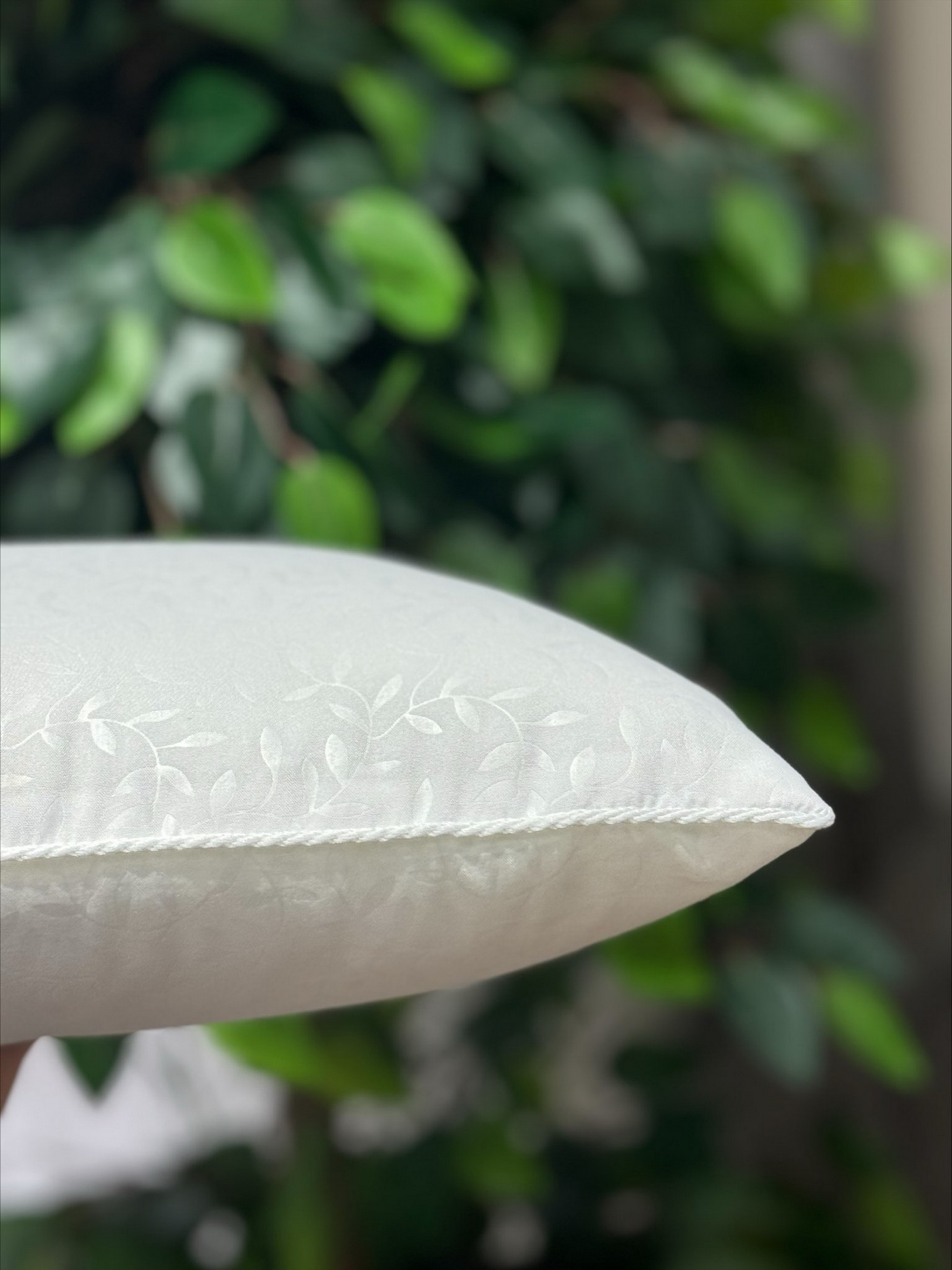 Подушка белый витой кант 45х45 пошита из жаккардовой ткани с листовым орнаментом и декорированна белым витым кантом.