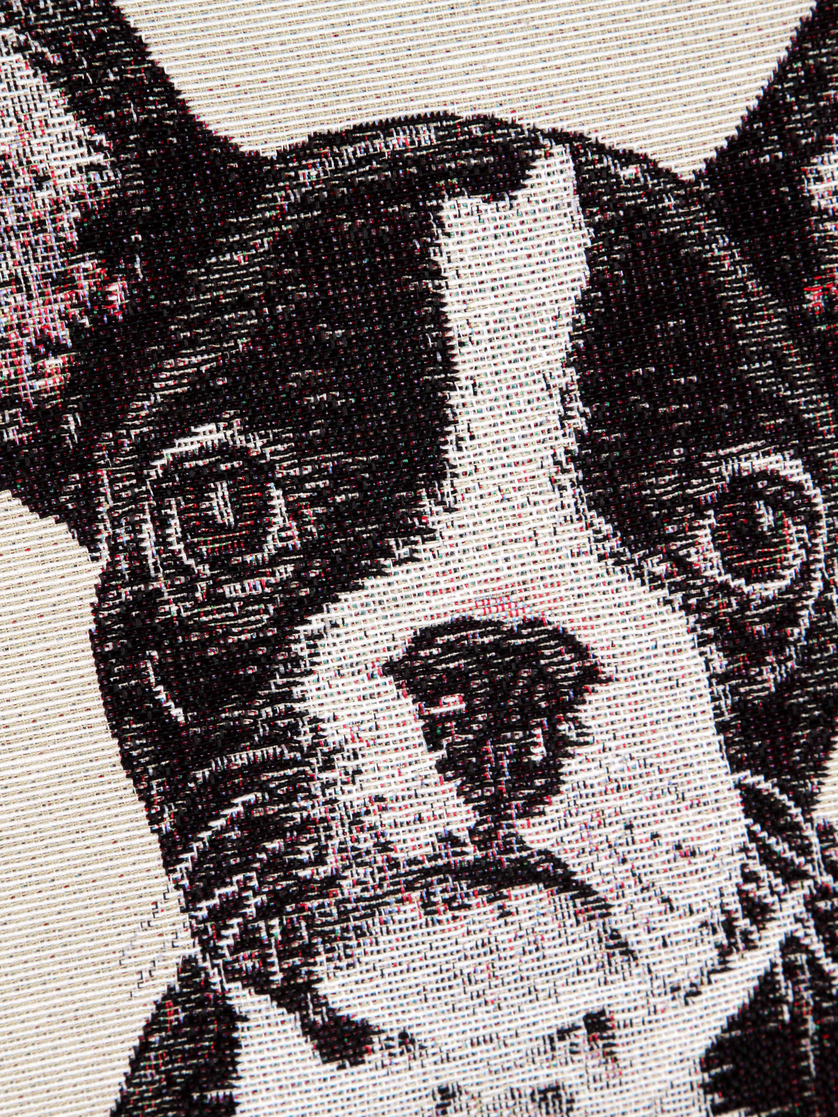 Рисунок создается переплетением нитей различных цветов и фактуры. Состав ткани: хлопок ( дающий фактуру и приятную тактильность ) и синтетические нити ( придающие износостойкость ). Плотность гобелена 410 г на кв.метр.