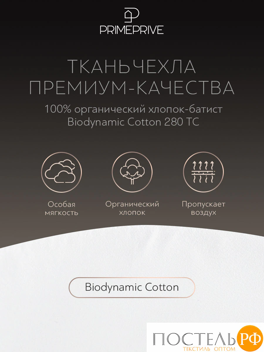 Чехол из 100% органического хлопка-батиста Biodynamic Cotton 280 ТС мягкий, гипоаллергенный и экологичный. Брендированный кант придаёт одеялу элегантный и стильный вид, а анатомическая стежка способствует более равномерному распределению тепла и улучшает комфорт во время сна.