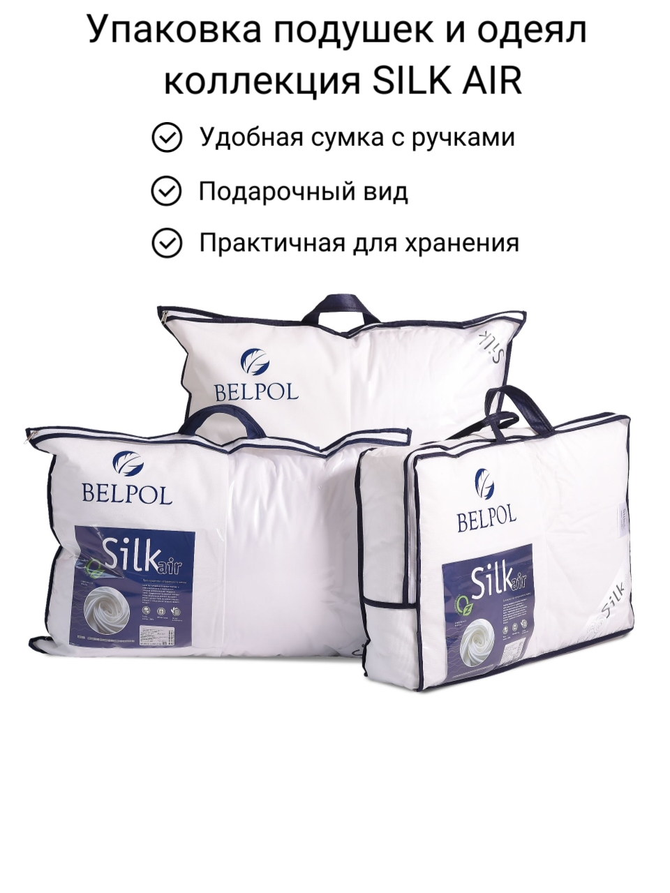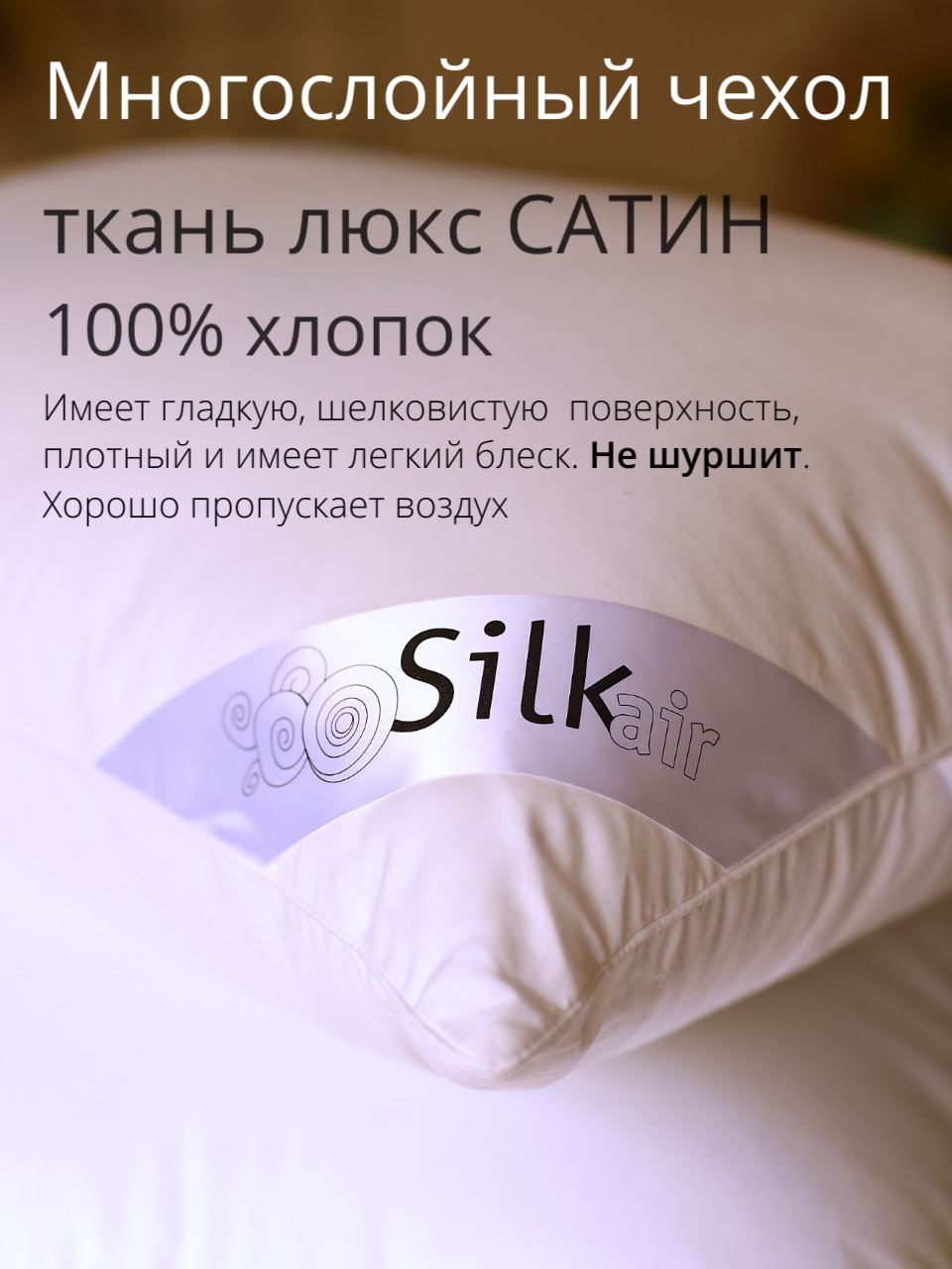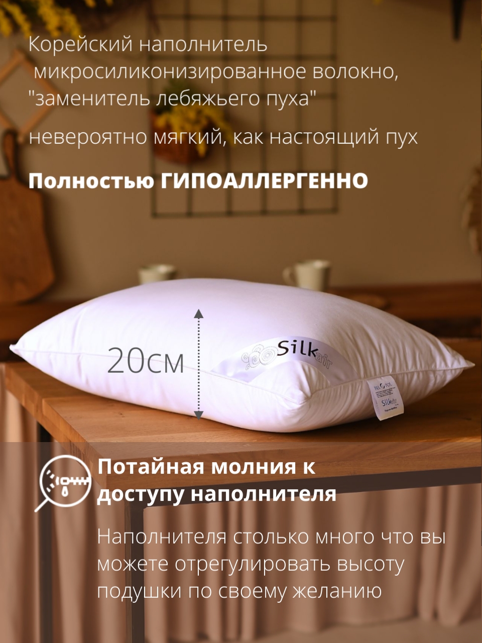 "Silk Air" - подушка со средней поддержкой головы для любой позы сна. Регулируемый объем, благодаря молнии, позволяет настроить мягкость наполнителя "Лебяжий пух" под индивидуальные предпочтения. Шелковое термополотно внутри снижает давление на кожу, разглаживает морщины, предотвращает электризацию волос и следы на лице после сна.