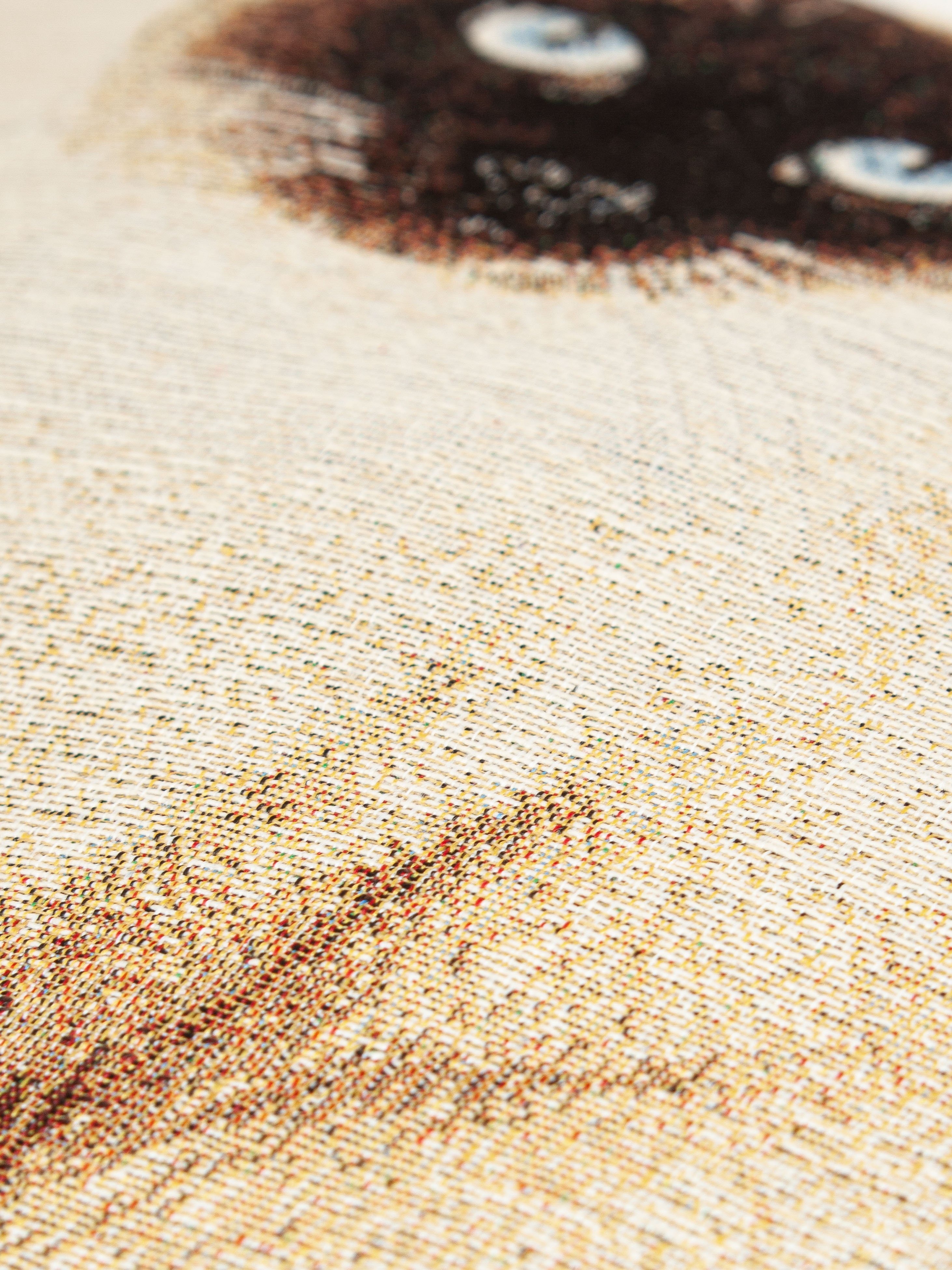 Рисунок создается переплетением нитей различных цветов и фактуры. Состав ткани: хлопок ( дающий фактуру и приятную тактильность ) и синтетические нити ( придающие износостойкость ). Плотность гобелена 410 г на кв.метр.