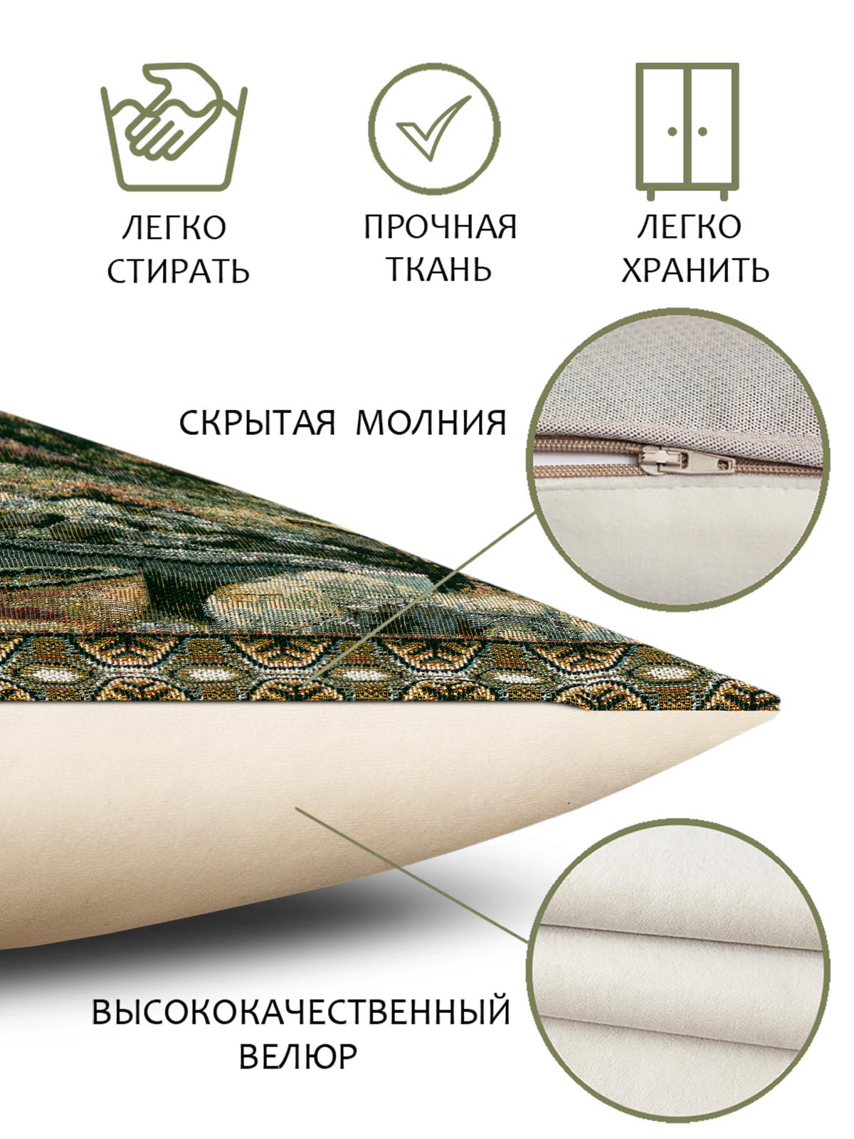 Рисунок создается переплетением нитей различных цветов и фактуры. Состав ткани: хлопок ( дающий фактуру и приятную тактильность ) и синтетические нити ( придающие износостойкость ). Плотность гобелена 410 г на кв.метр.