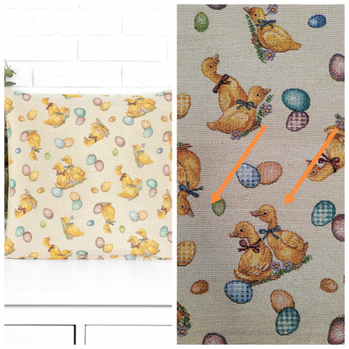 Рисунок создается переплетением нитей различных цветов и фактуры. Состав ткани: хлопок ( дающий фактуру и приятную тактильность ) и синтетические нити ( придающие износостойкость ). Плотность гобелена 410 г на кв.метр.