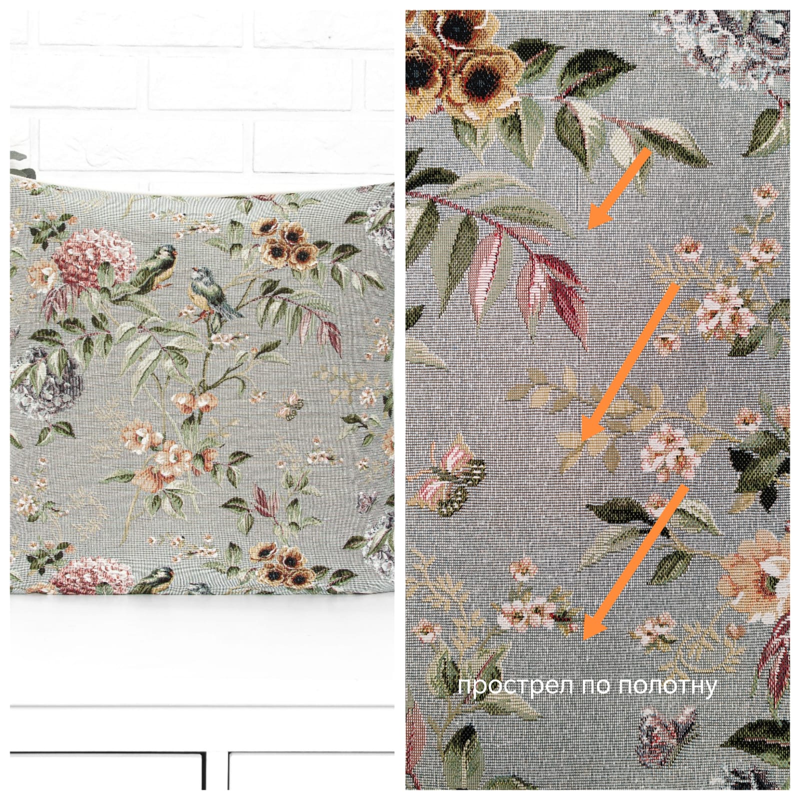 Рисунок создается переплетением нитей различных цветов и фактуры. Состав ткани: хлопок ( дающий фактуру и приятную тактильность ) и синтетические нити ( придающие износостойкость ). Плотность гобелена 410 г на кв.метр.