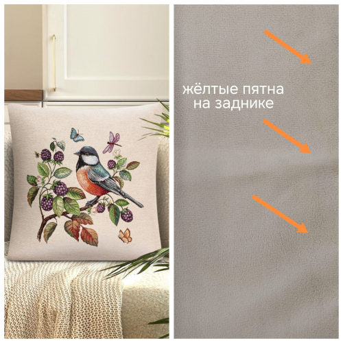 Рисунок создается переплетением нитей различных цветов и фактуры. Состав ткани: хлопок ( дающий фактуру и приятную тактильность ) и синтетические нити ( придающие износостойкость ). Плотность гобелена 410 г на кв.метр.
