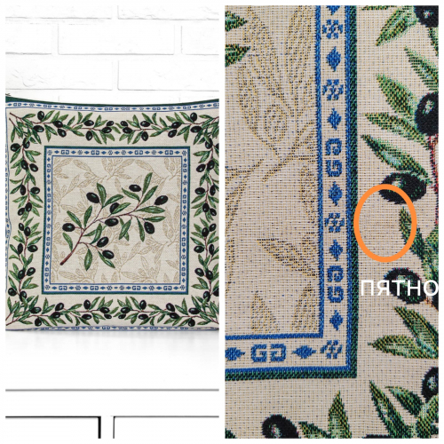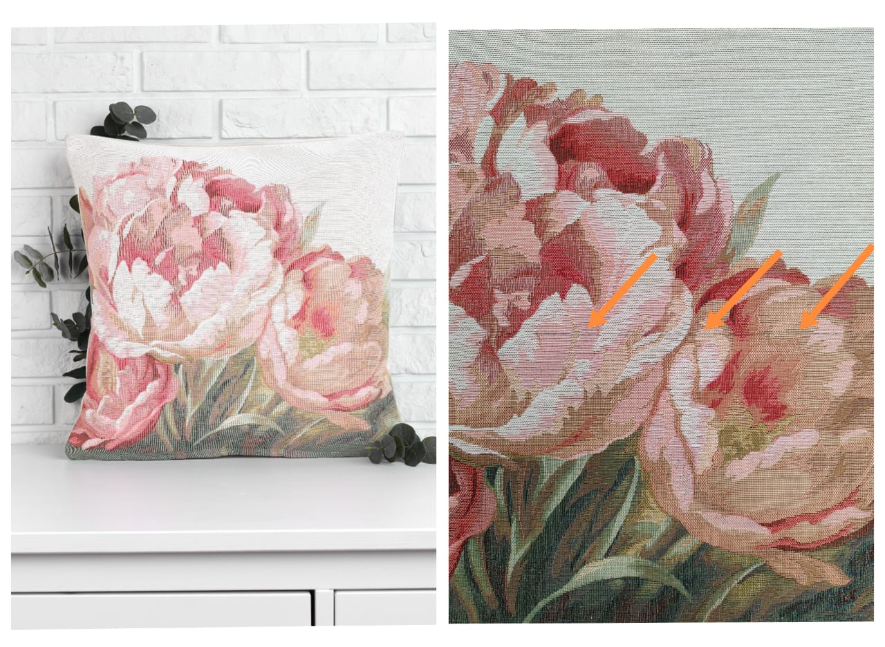 Рисунок создается переплетением нитей различных цветов и фактуры. Состав ткани: хлопок ( дающий фактуру и приятную тактильность ) и синтетические нити ( придающие износостойкость ). Плотность гобелена 410 г на кв.метр.