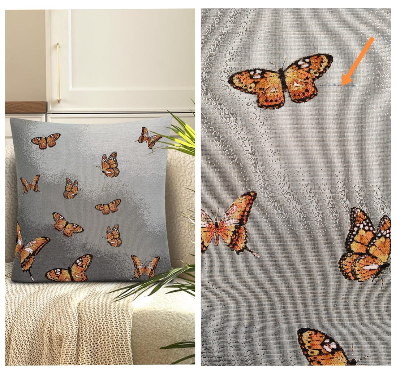 Рисунок создается переплетением нитей различных цветов и фактуры. Состав ткани: хлопок ( дающий фактуру и приятную тактильность ) и синтетические нити ( придающие износостойкость ). Плотность гобелена 410 г на кв.метр.