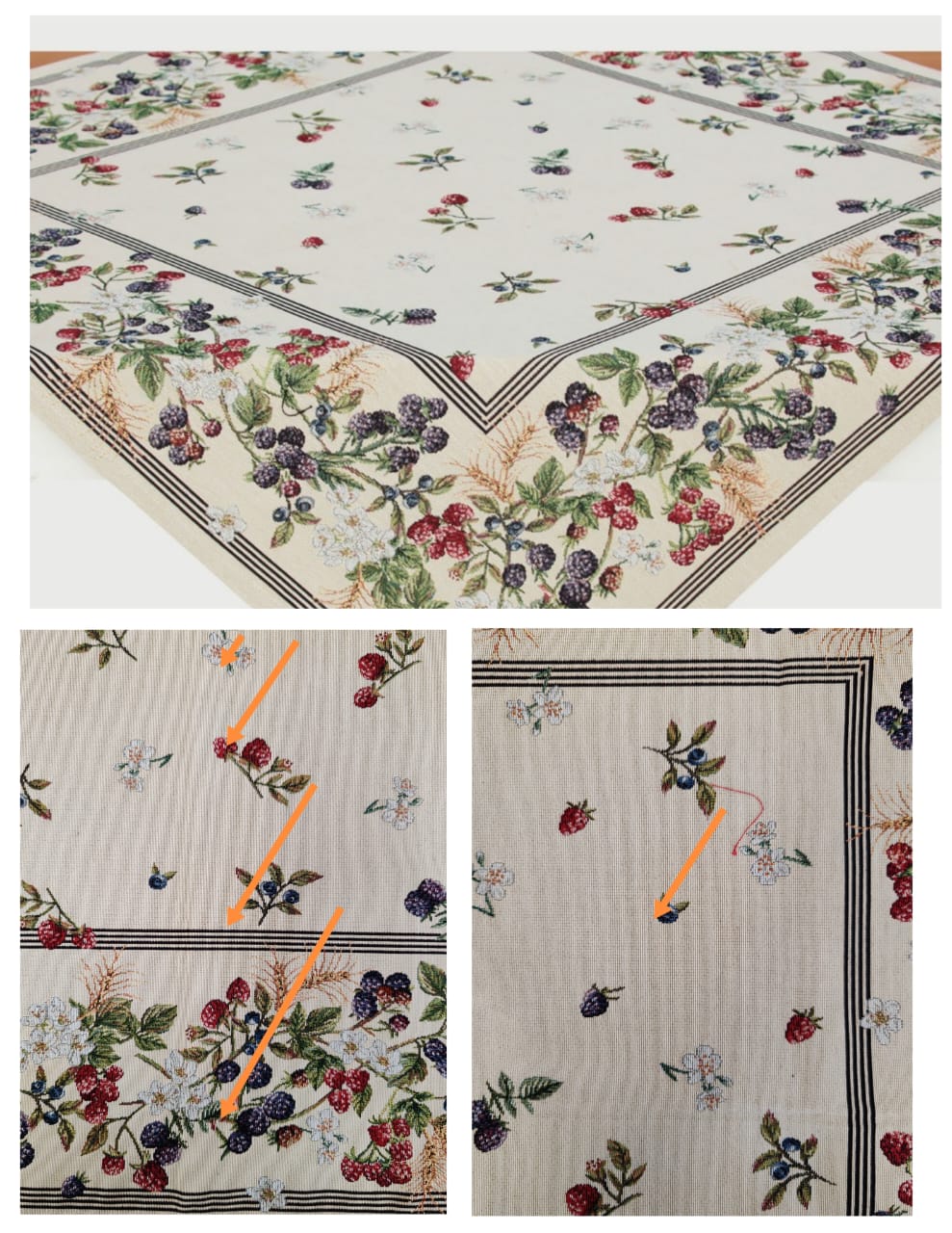 Рисунок создается переплетением нитей различных цветов и фактуры. Состав ткани: хлопок ( дающий фактуру и приятную тактильность ) и синтетические нити ( придающие износостойкость ). Плотность гобелена 410 г на кв.метр.