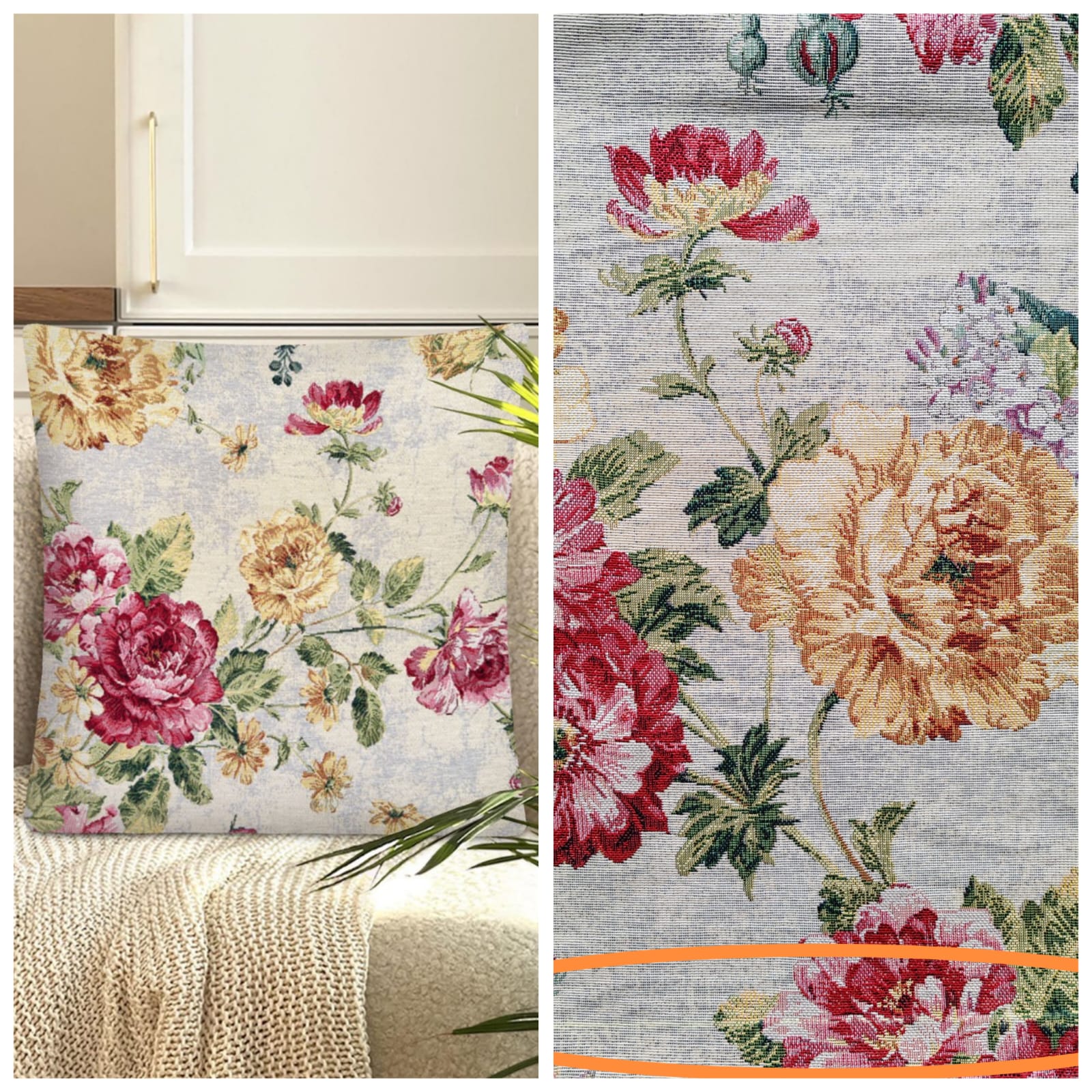 Рисунок создается переплетением нитей различных цветов и фактуры. Состав ткани: хлопок ( дающий фактуру и приятную тактильность ) и синтетические нити ( придающие износостойкость ). Плотность гобелена 410 г на кв.метр.