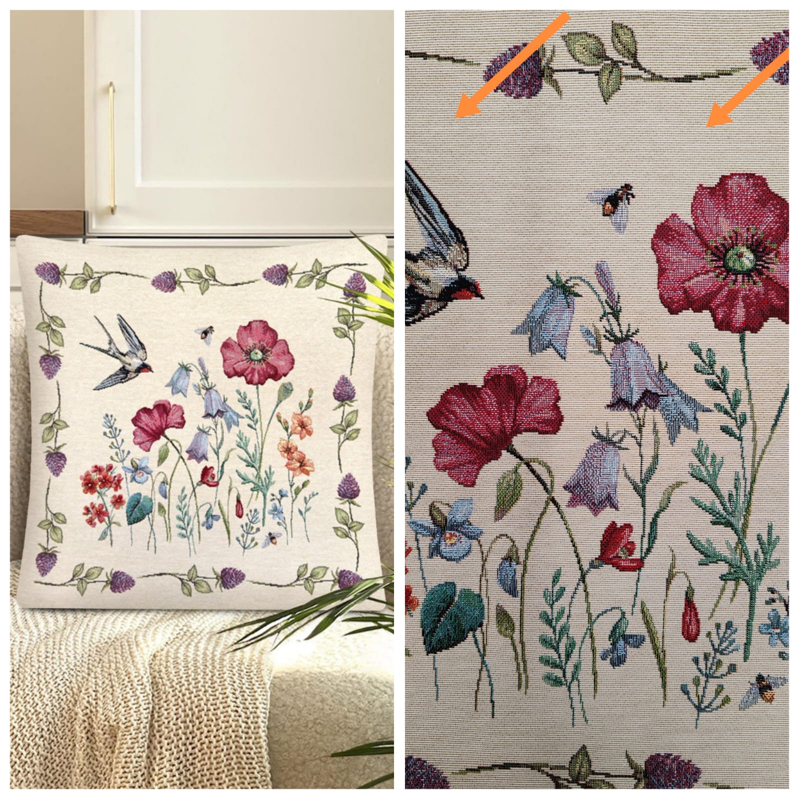 Рисунок создается переплетением нитей различных цветов и фактуры. Состав ткани: хлопок ( дающий фактуру и приятную тактильность ) и синтетические нити ( придающие износостойкость ). Плотность гобелена 410 г на кв.метр.