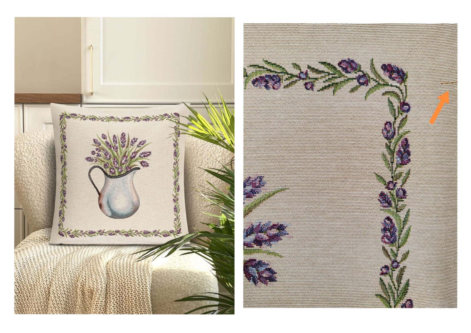 Рисунок создается переплетением нитей различных цветов и фактуры. Состав ткани: хлопок ( дающий фактуру и приятную тактильность ) и синтетические нити ( придающие износостойкость ). Плотность гобелена 410 г на кв.метр.