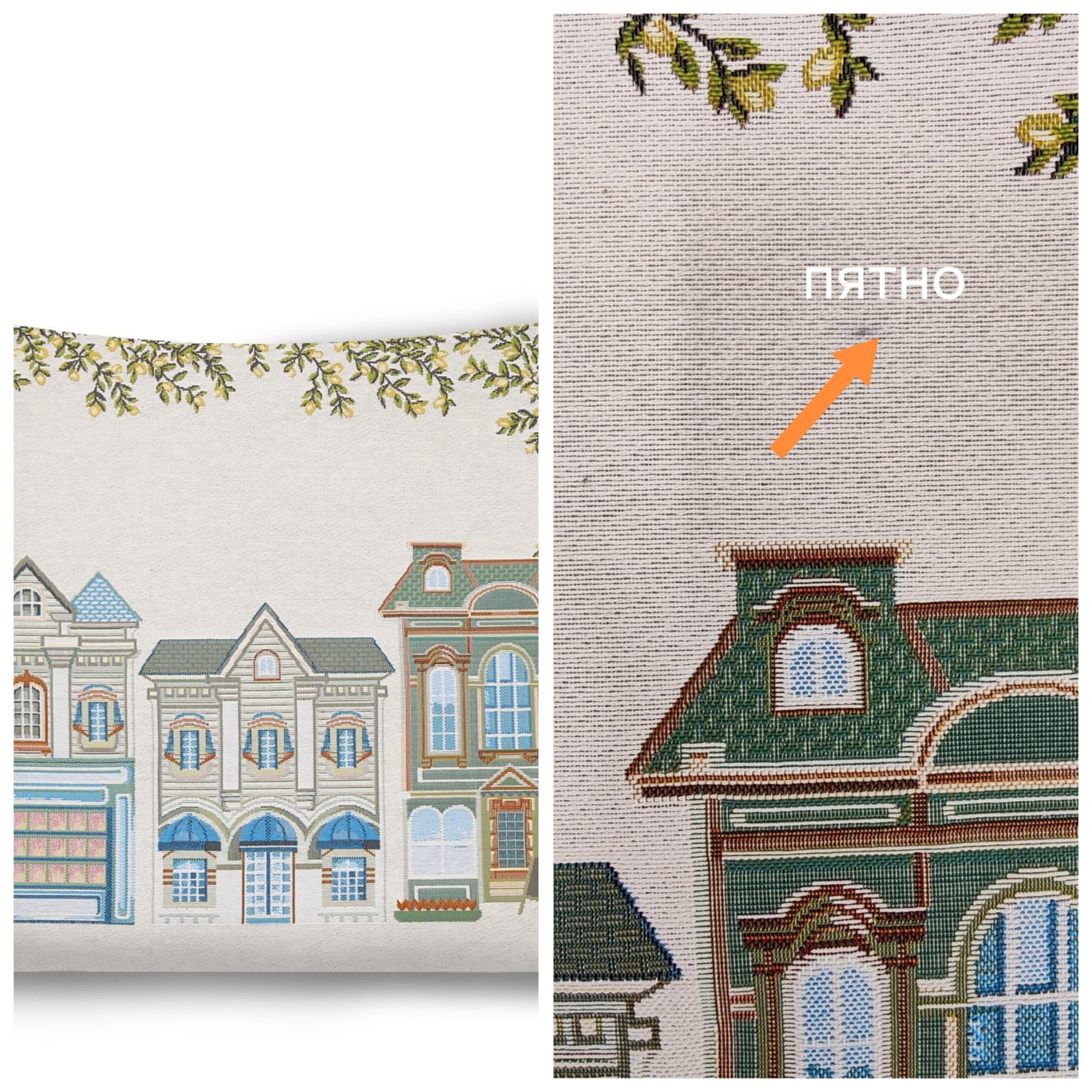 Рисунок создается переплетением нитей различных цветов и фактуры. Состав ткани: хлопок ( дающий фактуру и приятную тактильность ) и синтетические нити ( придающие износостойкость ). Плотность гобелена 410 г на кв.метр.