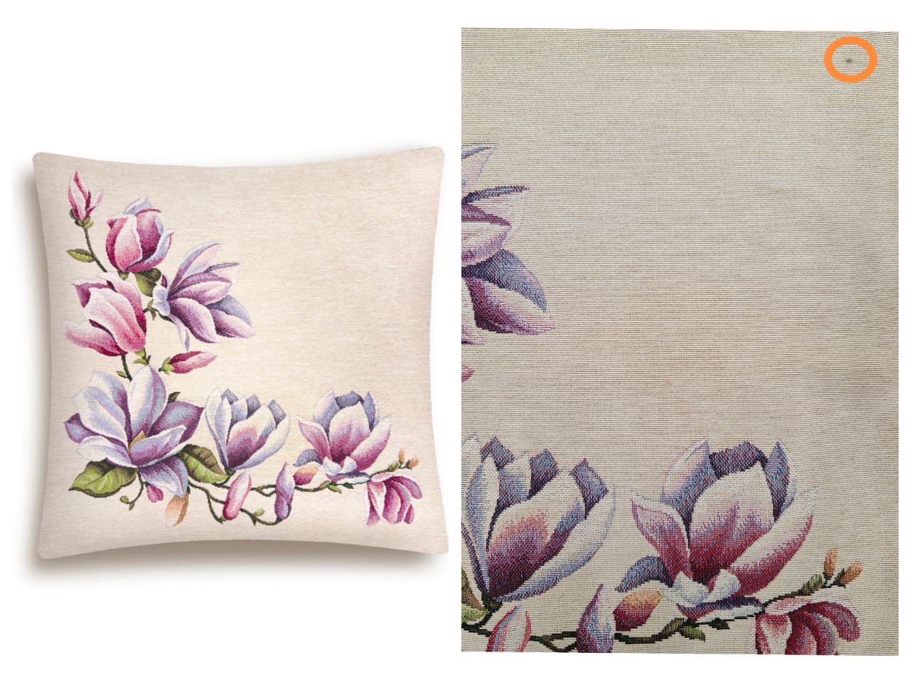 Рисунок создается переплетением нитей различных цветов и фактуры. Состав ткани: хлопок ( дающий фактуру и приятную тактильность ) и синтетические нити ( придающие износостойкость ). Плотность гобелена 410 г на кв.метр.