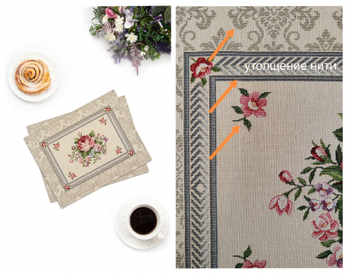 Рисунок создается переплетением нитей различных цветов и фактуры. Состав ткани: хлопок ( дающий фактуру и приятную тактильность ) и синтетические нити ( придающие износостойкость ). Плотность гобелена 410 г на кв.метр.
