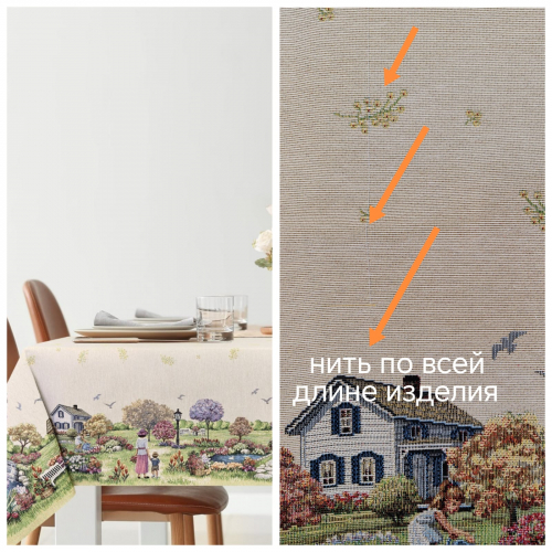 Рисунок создается переплетением нитей различных цветов и фактуры. Состав ткани: хлопок ( дающий фактуру и приятную тактильность ) и синтетические нити ( придающие износостойкость ). Плотность гобелена 410 г на кв.метр.
