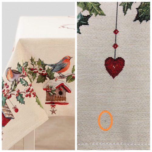 Рисунок создается переплетением нитей различных цветов и фактуры. Состав ткани: хлопок ( дающий фактуру и приятную тактильность ) и синтетические нити ( придающие износостойкость ). Плотность гобелена 410 г на кв.метр.