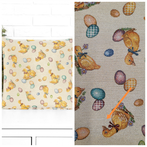Рисунок создается переплетением нитей различных цветов и фактуры. Состав ткани: хлопок ( дающий фактуру и приятную тактильность ) и синтетические нити ( придающие износостойкость ). Плотность гобелена 410 г на кв.метр.