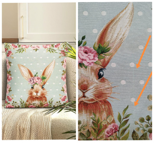 Рисунок создается переплетением нитей различных цветов и фактуры. Состав ткани: хлопок ( дающий фактуру и приятную тактильность ) и синтетические нити ( придающие износостойкость ). Плотность гобелена 410 г на кв.метр.
