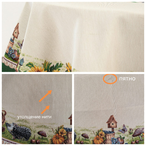 Рисунок создается переплетением нитей различных цветов и фактуры. Состав ткани: хлопок ( дающий фактуру и приятную тактильность ) и синтетические нити ( придающие износостойкость ). Плотность гобелена 410 г на кв.метр.