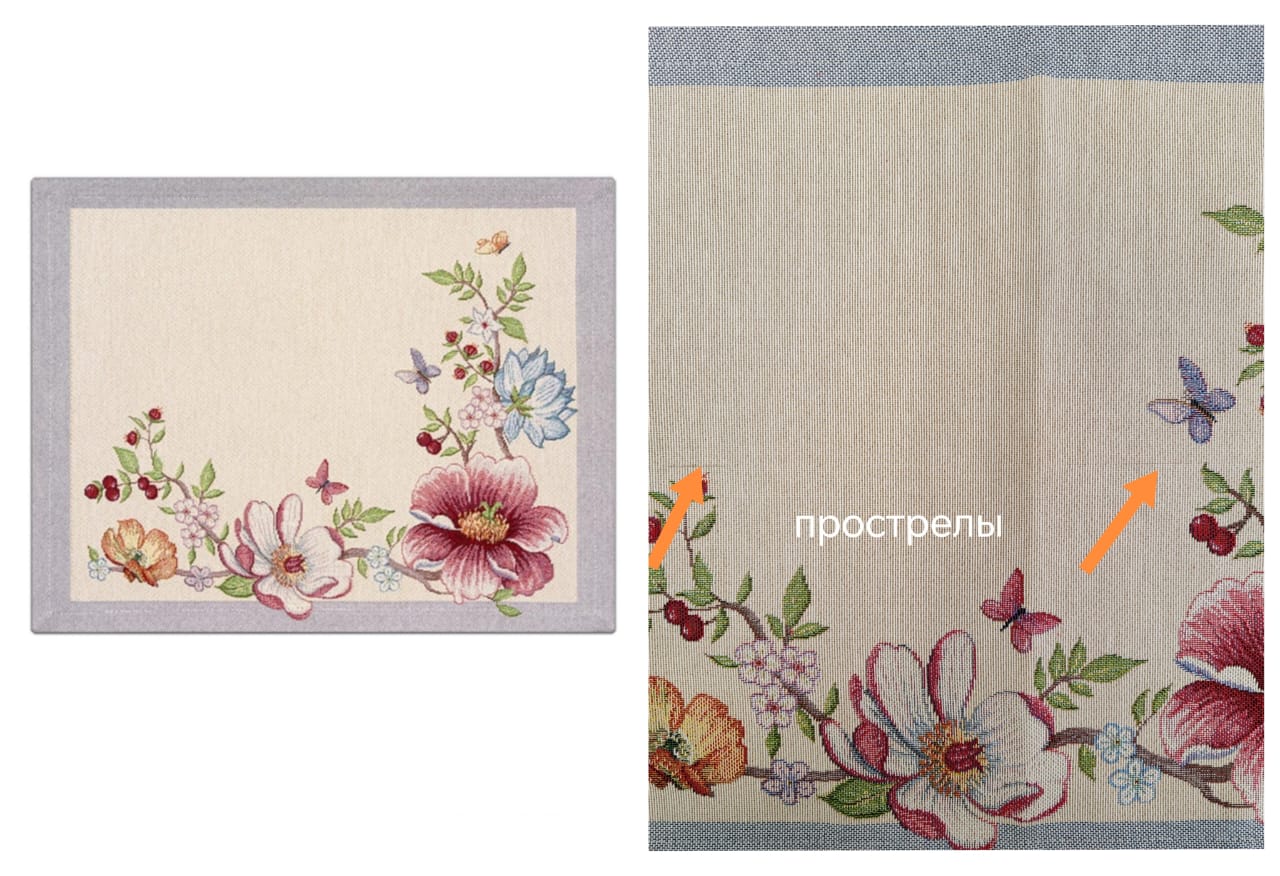 Рисунок создается переплетением нитей различных цветов и фактуры. Состав ткани: хлопок ( дающий фактуру и приятную тактильность ) и синтетические нити ( придающие износостойкость ). Плотность гобелена 410 г на кв.метр.