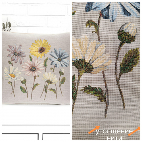 Рисунок создается переплетением нитей различных цветов и фактуры. Состав ткани: хлопок ( дающий фактуру и приятную тактильность ) и синтетические нити ( придающие износостойкость ). Плотность гобелена 410 г на кв.метр.