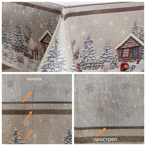 Рисунок создается переплетением нитей различных цветов и фактуры. Состав ткани: хлопок ( дающий фактуру и приятную тактильность ) и синтетические нити ( придающие износостойкость ). Плотность гобелена 410 г на кв.метр.