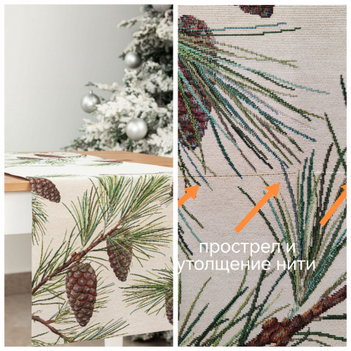 Рисунок создается переплетением нитей различных цветов и фактуры. Состав ткани: хлопок ( дающий фактуру и приятную тактильность ) и синтетические нити ( придающие износостойкость ). Плотность гобелена 410 г на кв.метр.