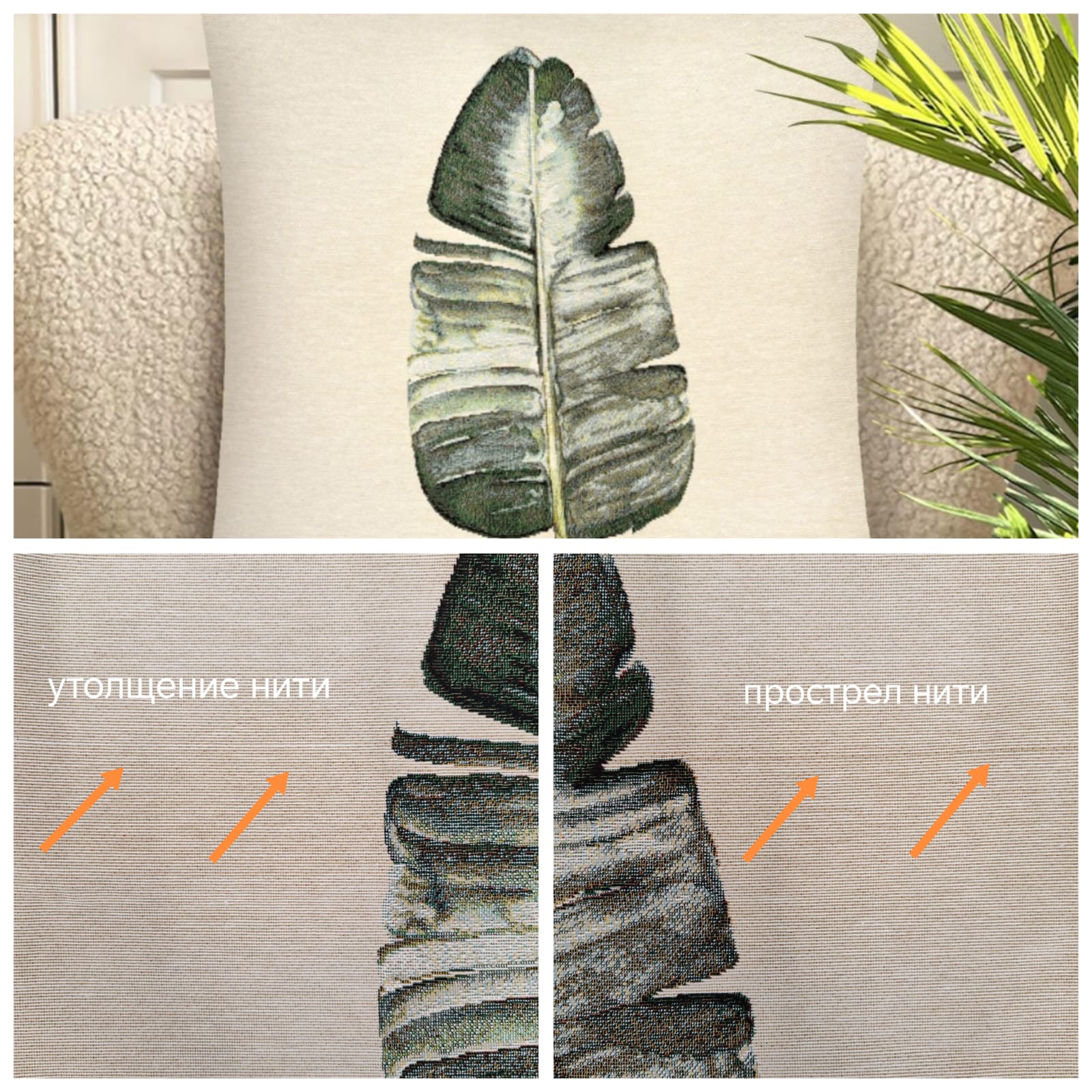 Рисунок создается переплетением нитей различных цветов и фактуры. Состав ткани: хлопок ( дающий фактуру и приятную тактильность ) и синтетические нити ( придающие износостойкость ). Плотность гобелена 410 г на кв.метр.