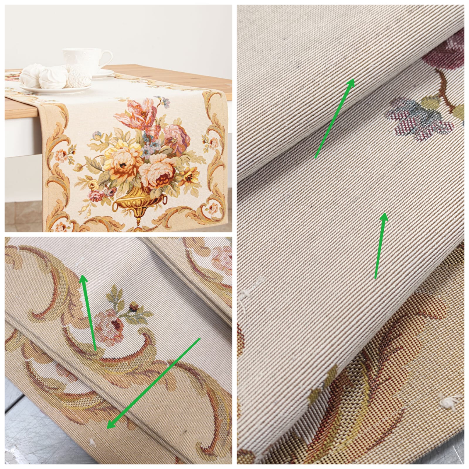 Рисунок создается переплетением нитей различных цветов и фактуры. Состав ткани: хлопок ( дающий фактуру и приятную тактильность ) и синтетические нити ( придающие износостойкость ). Плотность гобелена 410 г на кв.метр.