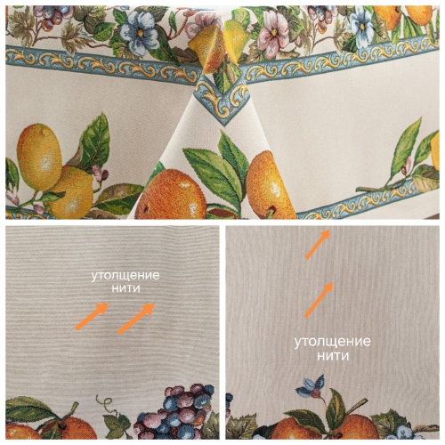 Рисунок создается переплетением нитей различных цветов и фактуры. Состав ткани: хлопок ( дающий фактуру и приятную тактильность ) и синтетические нити ( придающие износостойкость ). Плотность гобелена 410 г на кв.метр.