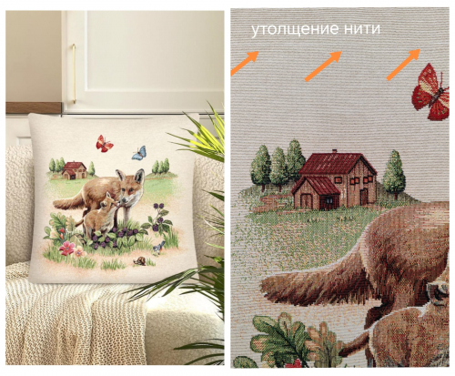 Рисунок создается переплетением нитей различных цветов и фактуры. Состав ткани: хлопок ( дающий фактуру и приятную тактильность ) и синтетические нити ( придающие износостойкость ). Плотность гобелена 410 г на кв.метр.