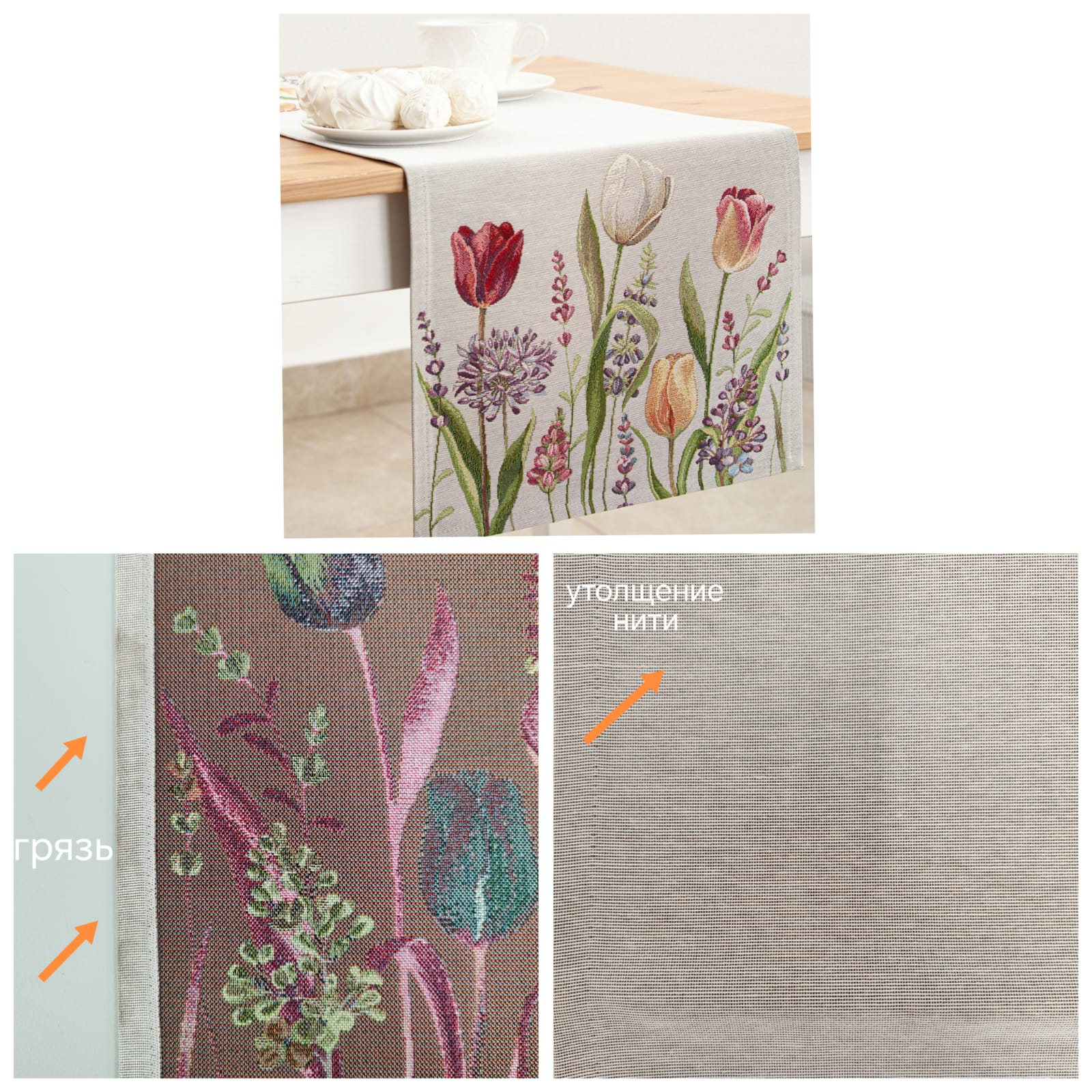 Рисунок создается переплетением нитей различных цветов и фактуры. Состав ткани: хлопок ( дающий фактуру и приятную тактильность ) и синтетические нити ( придающие износостойкость ). Плотность гобелена 410 г на кв.метр.