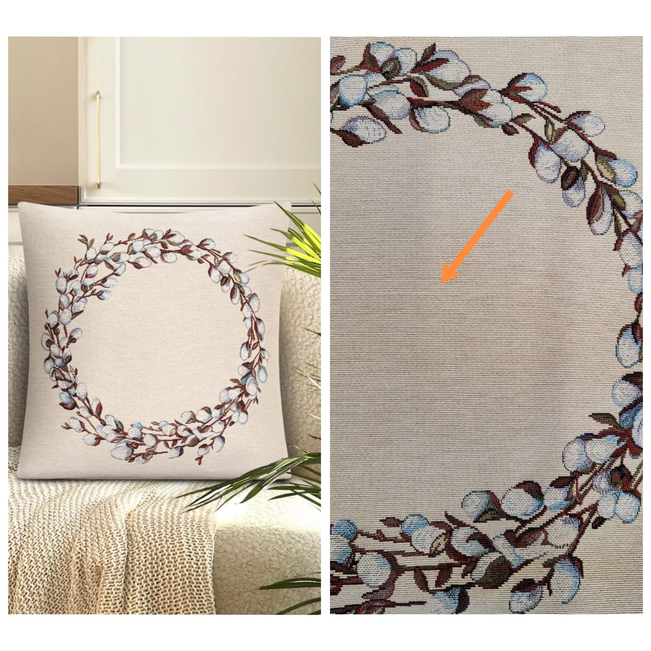 Рисунок создается переплетением нитей различных цветов и фактуры. Состав ткани: хлопок ( дающий фактуру и приятную тактильность ) и синтетические нити ( придающие износостойкость ). Плотность гобелена 410 г на кв.метр.