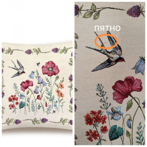 Рисунок создается переплетением нитей различных цветов и фактуры. Состав ткани: хлопок ( дающий фактуру и приятную тактильность ) и синтетические нити ( придающие износостойкость ). Плотность гобелена 410 г на кв.метр.