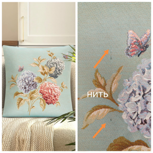Рисунок создается переплетением нитей различных цветов и фактуры. Состав ткани: хлопок ( дающий фактуру и приятную тактильность ) и синтетические нити ( придающие износостойкость ). Плотность гобелена 410 г на кв.метр.
