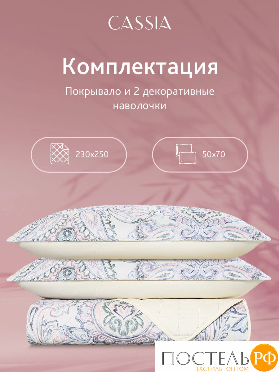 Комплект «Демре»: покрывало (230*250 см) и 2 декоративные наволочки (50*70 см). Ткань лицевая: 100% микрофибра 75 г/м2, диджитал-принт. Наполнитель: полиэфирное волокно 15 г/м2, ткань оборотная — 100% микрофибра однотонная.