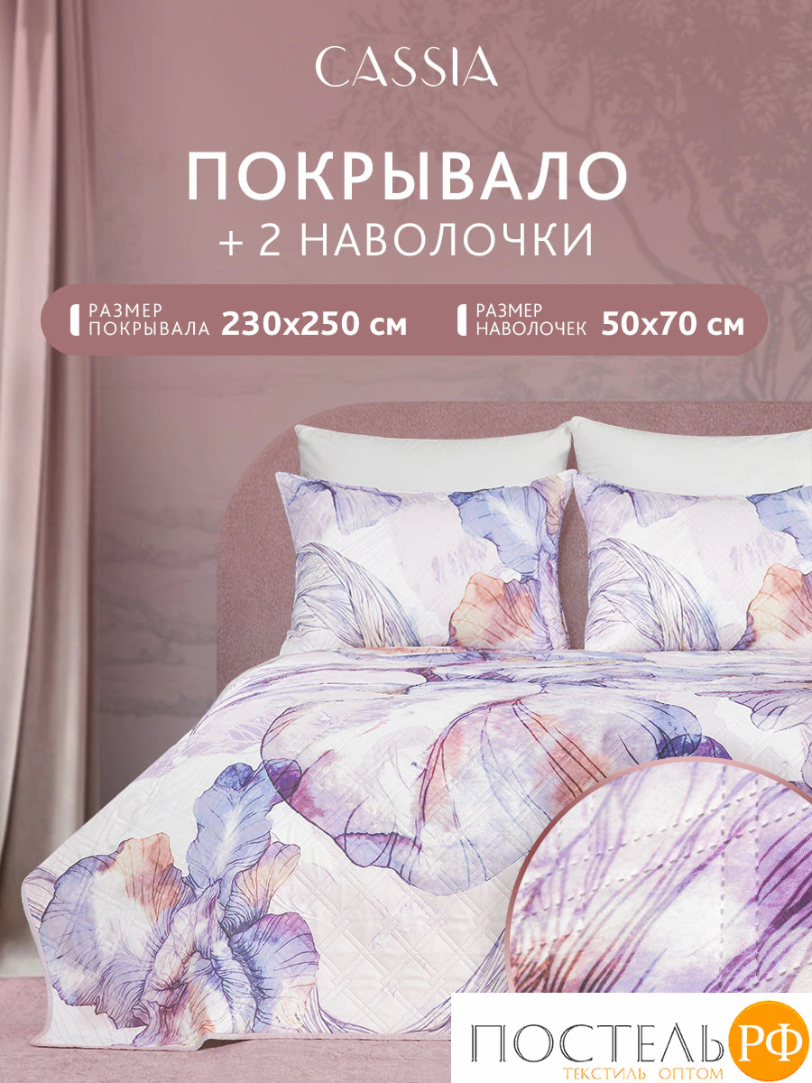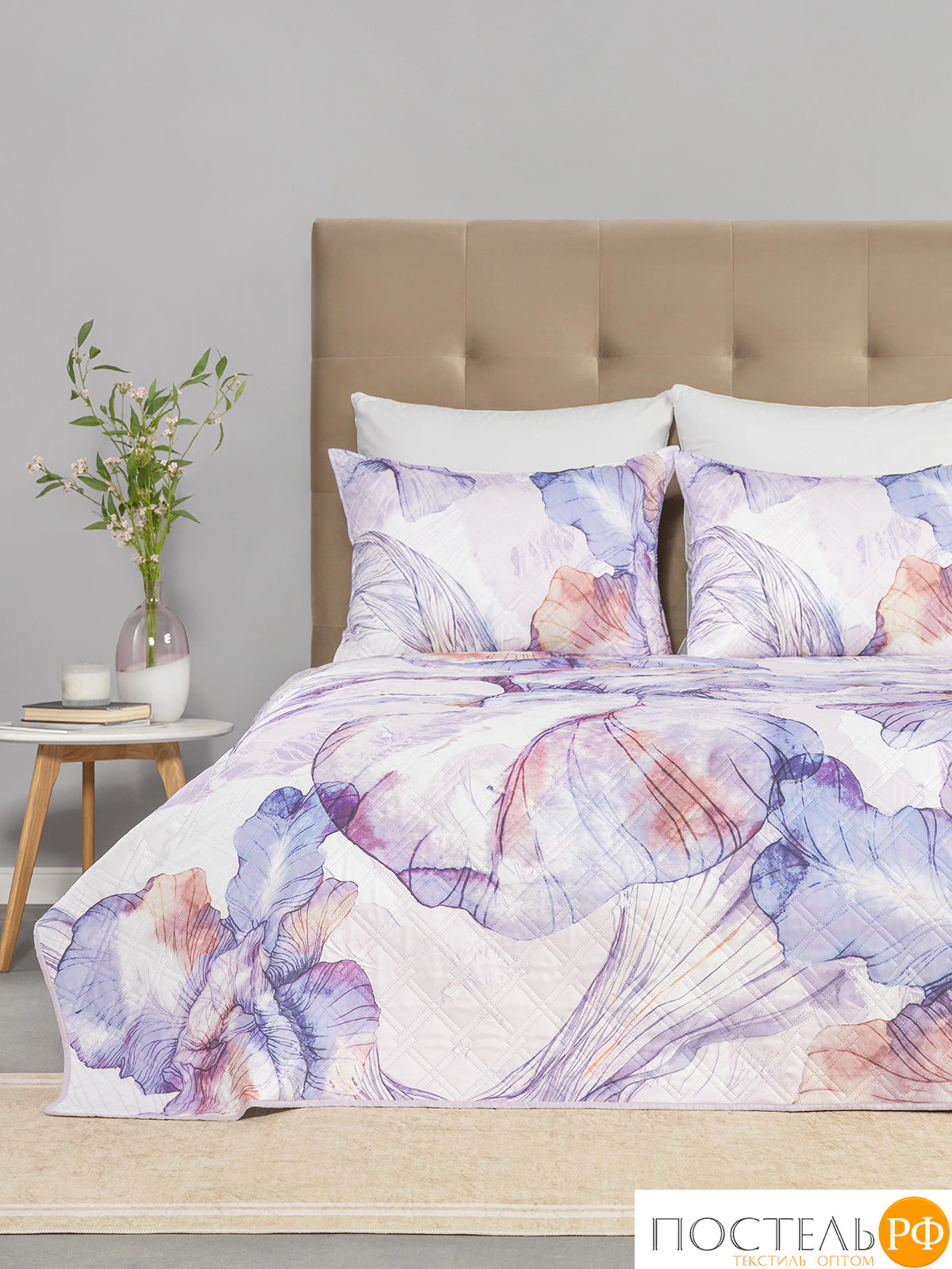 Комплект «Ирисы»: покрывало (230*250 см) и 2 декоративные наволочки (50*70 см). Ткань лицевая: 100% микрофибра 75 г/м2, диджитал-принт. Наполнитель: полиэфирное волокно 15 г/м2, ткань оборотная — 100% микрофибра однотонная.