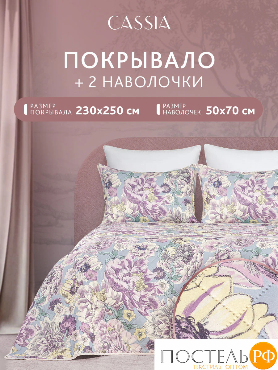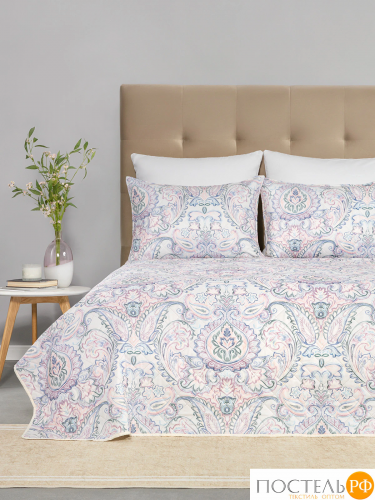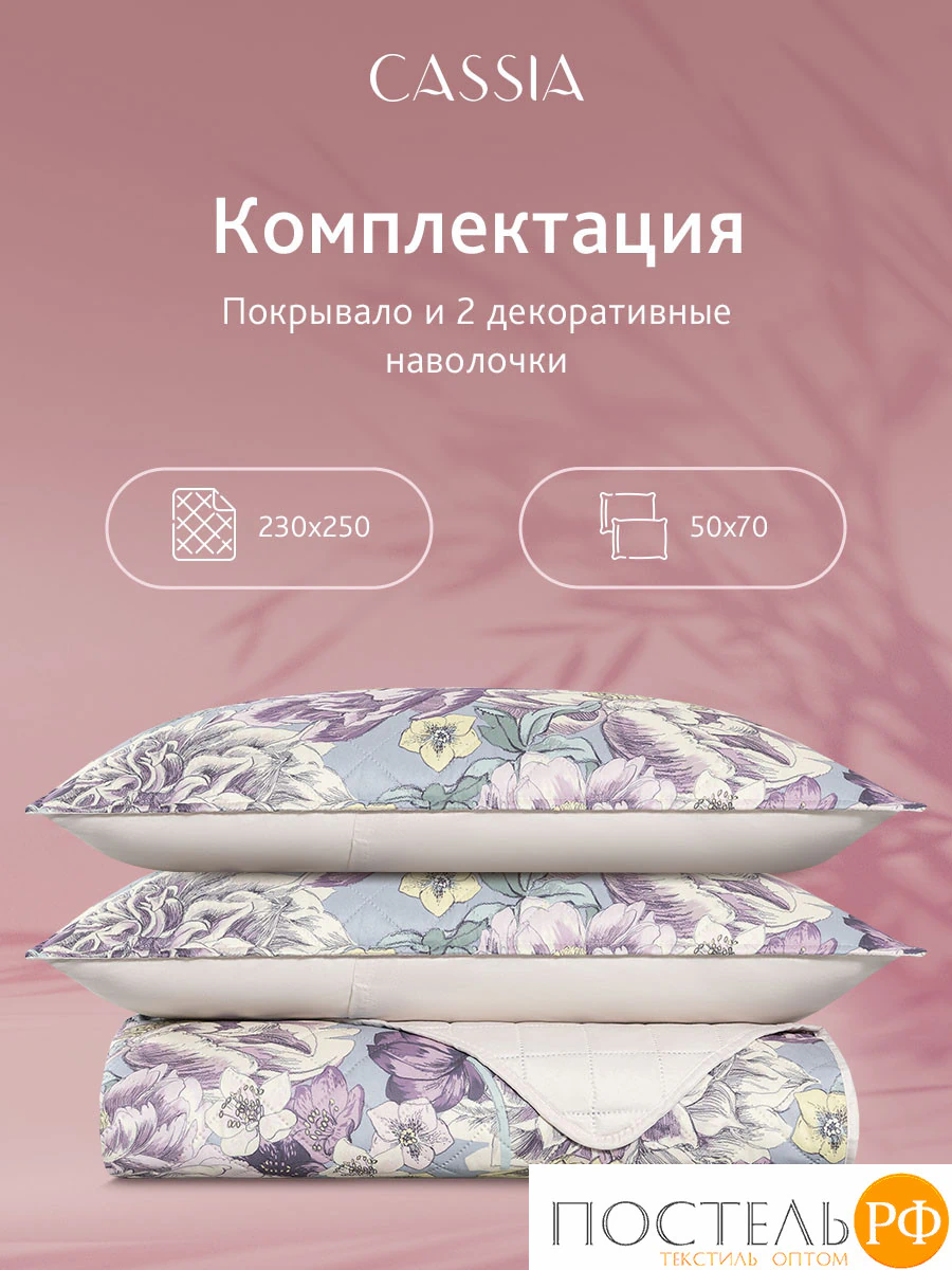 Комплект «Соланж»: покрывало (230*250 см) и 2 декоративные наволочки (50*70 см). Ткань лицевая: 100% микрофибра 75 г/м2, диджитал-принт. Наполнитель: полиэфирное волокно 15 г/м2, ткань оборотная — 100% микрофибра однотонная.