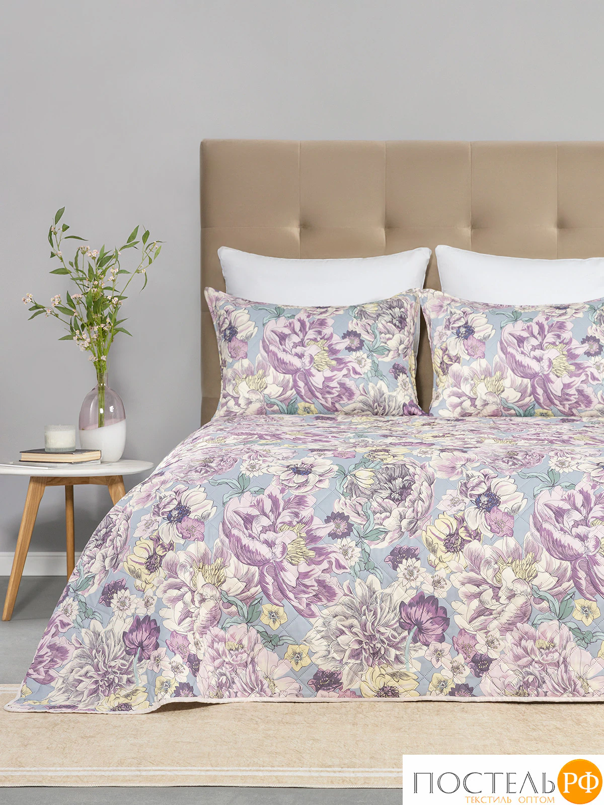 Это изысканное покрывало и наволочки украшены эффектным флоральным принтом. Крупные цветы сиреневых оттенков красиво выделяются на фоне светлой аквамариновой ткани. Выразительный рисунок подчеркивает мягкость 100% микрофибры. Покрывало легко расстилается, не тускнеет и сохраняет первоначальный вид даже после многократной чистки.