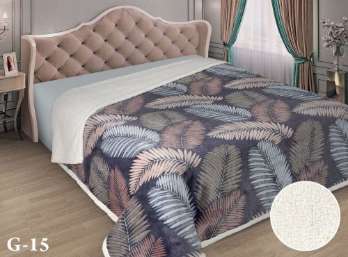Одна сторона - нежный велюр с набивным абстрактным рисунком . обратная сторона - мягкий. шелковистый мех с имитацией овечьей шерсти.