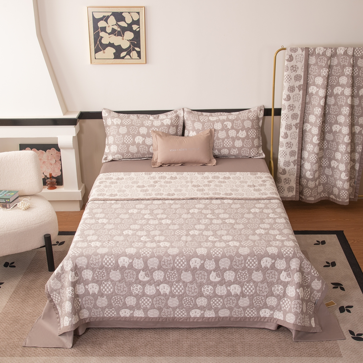 Покрывало выполнено из жаккардового муслина с декоративной простёжкой, формирующей утончённый рельефный узор. Ткань отличается мягкостью, лёгким благородным блеском и изысканной текстурой. Завершает композицию широкий кант, который визуально объединяет элементы комплекта и придаёт образу гармоничную завершённость.