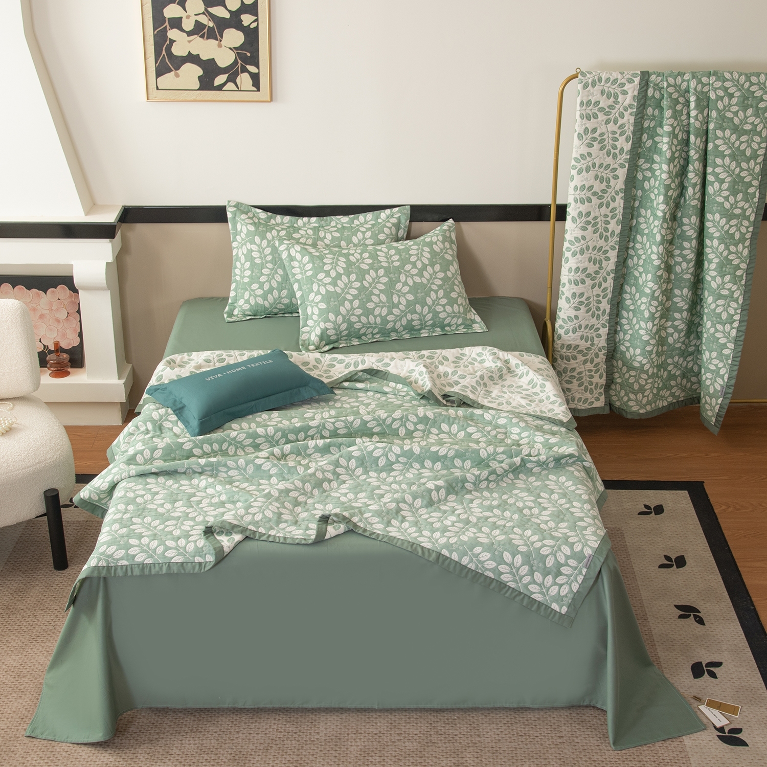 Покрывало выполнено из жаккардового муслина с декоративной простёжкой, формирующей утончённый рельефный узор. Ткань отличается мягкостью, лёгким благородным блеском и изысканной текстурой. Завершает композицию широкий кант, придающий изделию гармоничную завершённость.