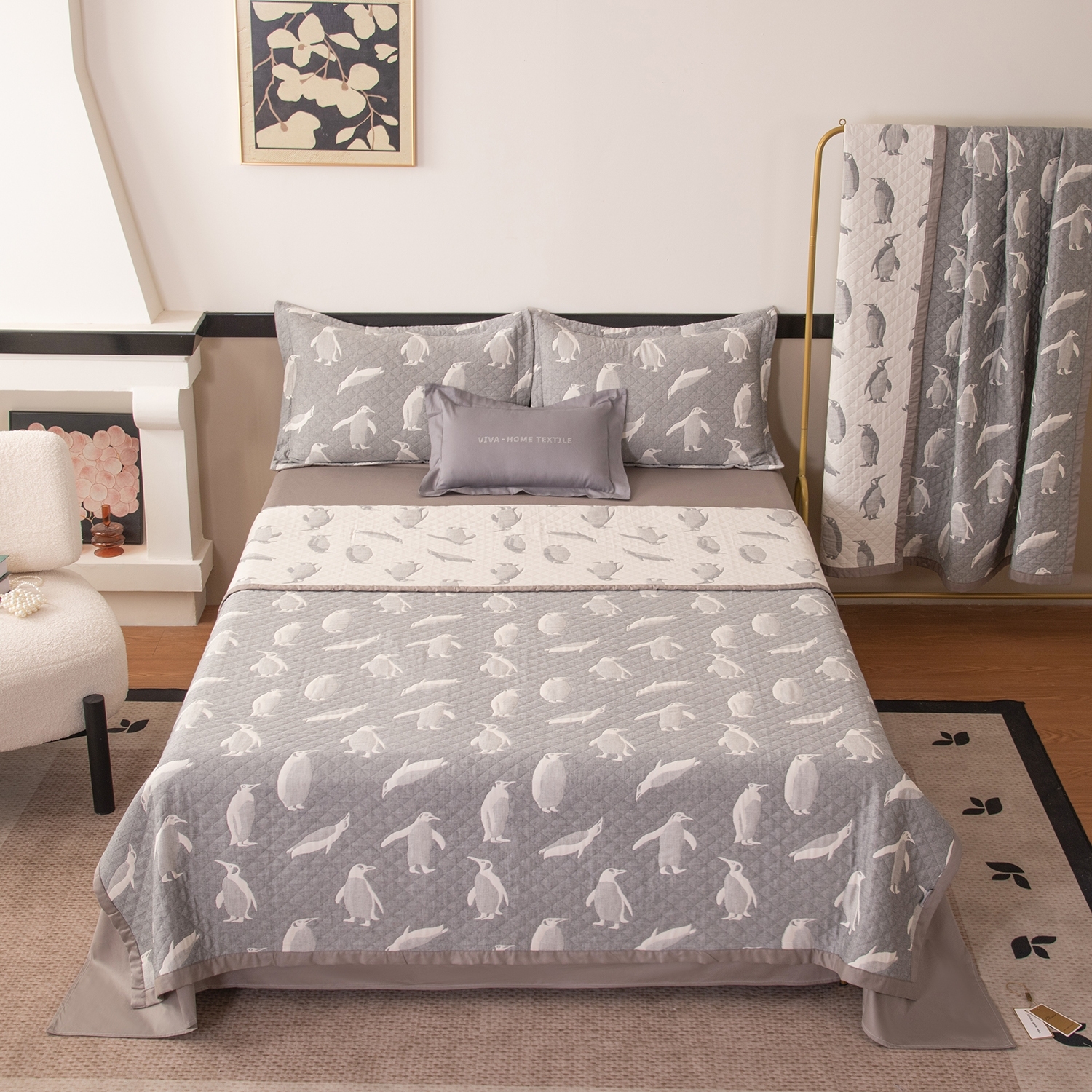 Реверсивный дизайн покрывала с инверсией оттенков позволяет выбрать настроение пространства: на одной стороне - светлый фон с мягким контрастным рисунком, на другой - более тёмный фон со светлым узором. Игра фактур и тонов делает покрывало выразительным акцентом в интерьере и позволяет легко менять облик спальни