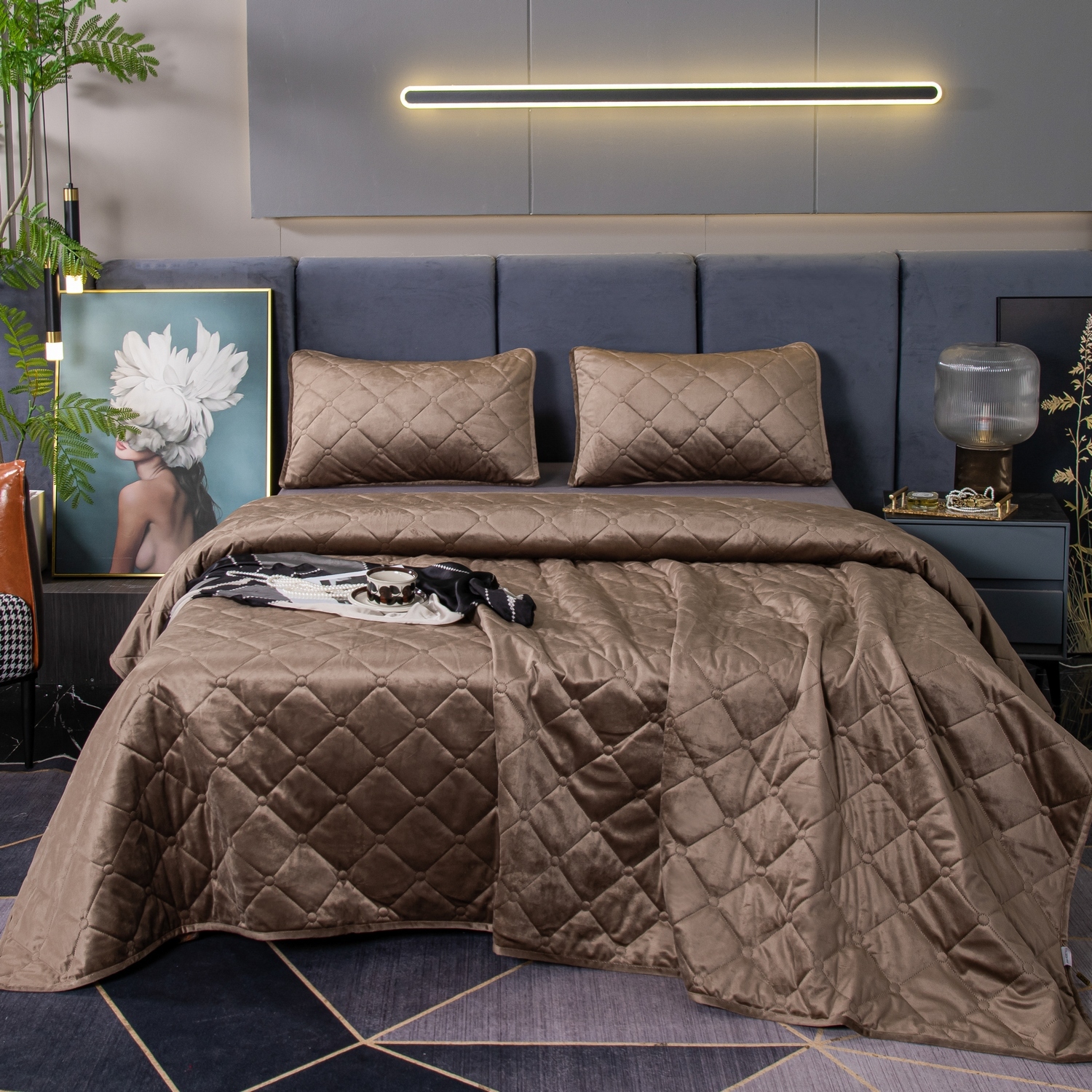 Велюровое покрывало с ромбовидной стежкой: мягкая текстура велюра и приятная цветовая гамма станут прекрасным дополнением интерьера вашей спальни. Кровать с таким покрывалом будет выглядеть стильно и дорого