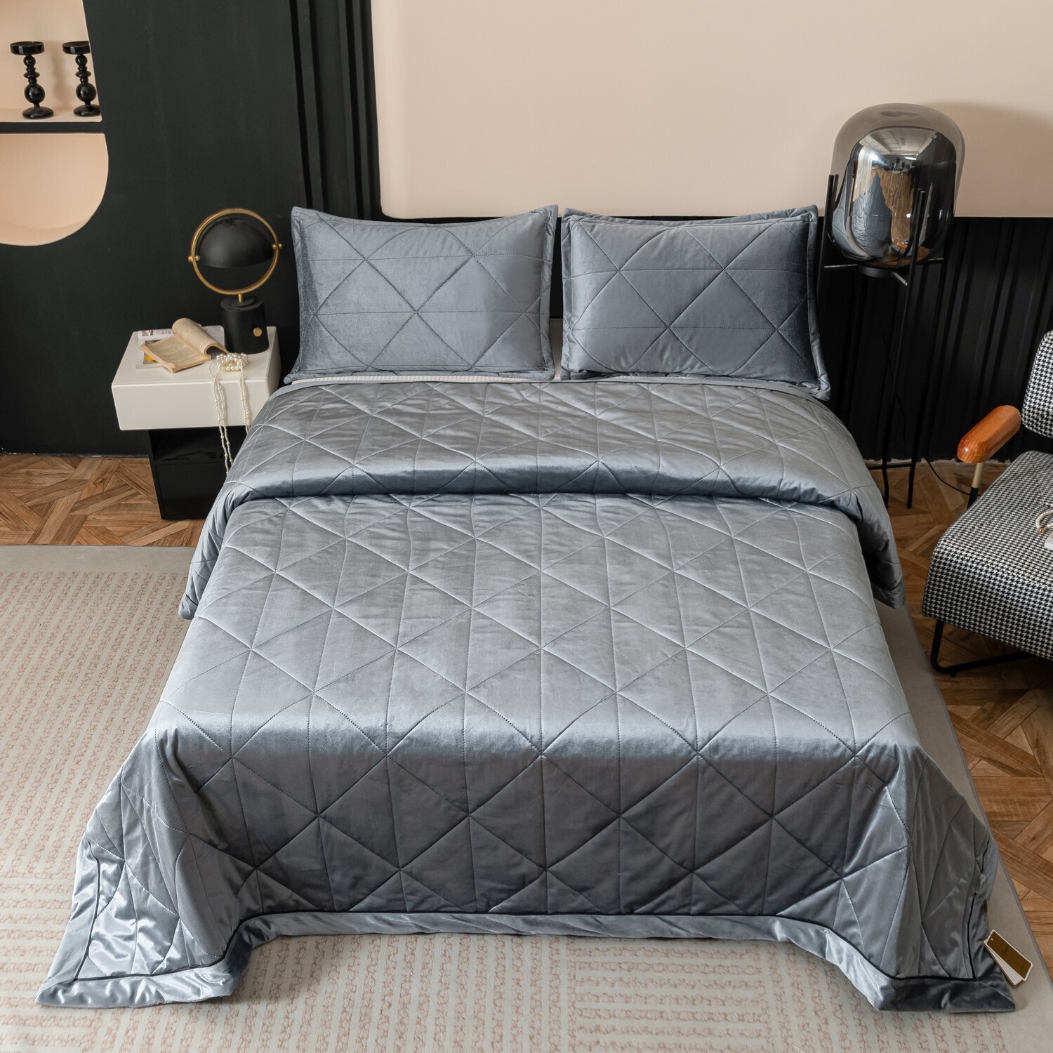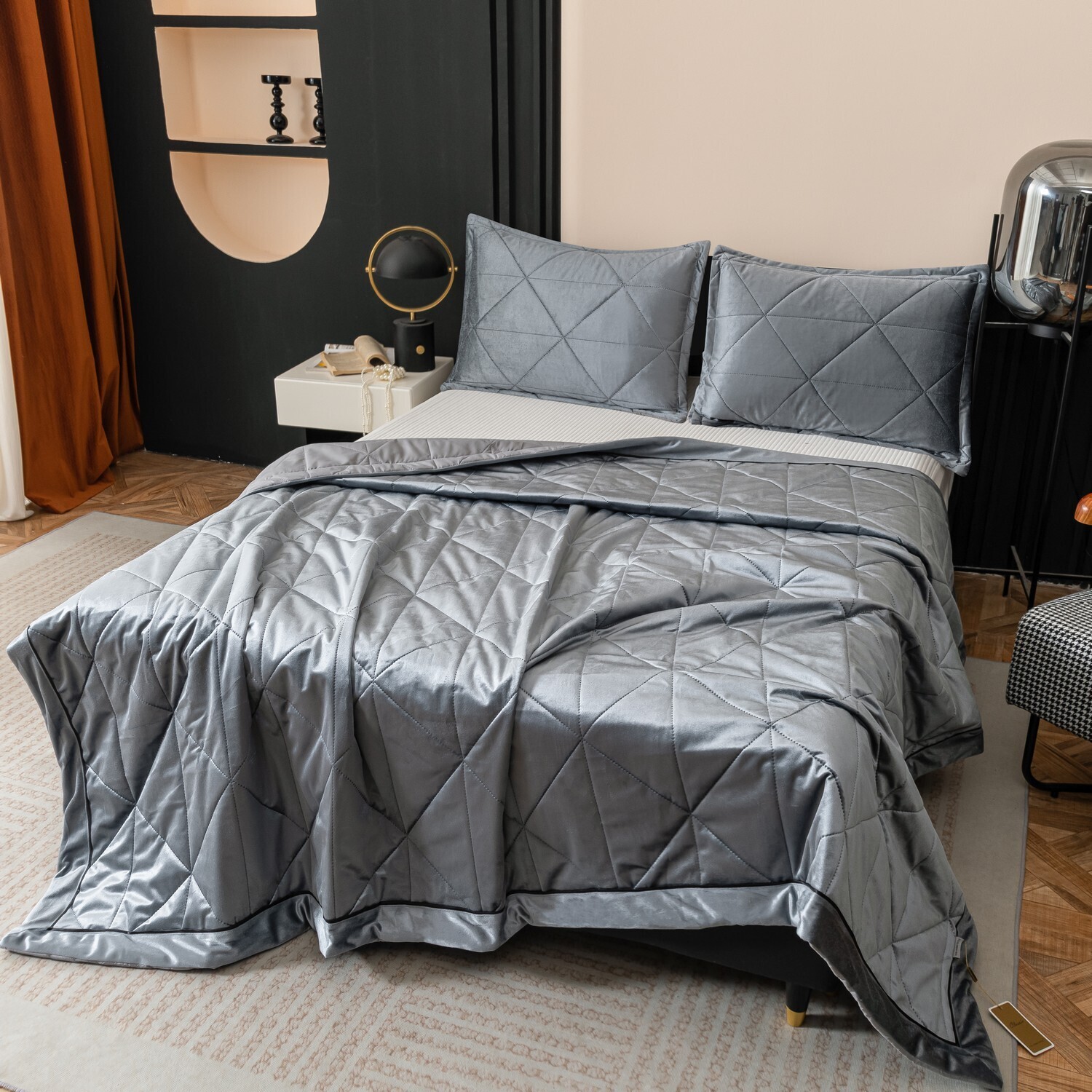 Геометрический узор на покрывале выполнен с использованием термостежки, что придаёт изделию особую изысканность и подчёркивает элегантность интерьера.